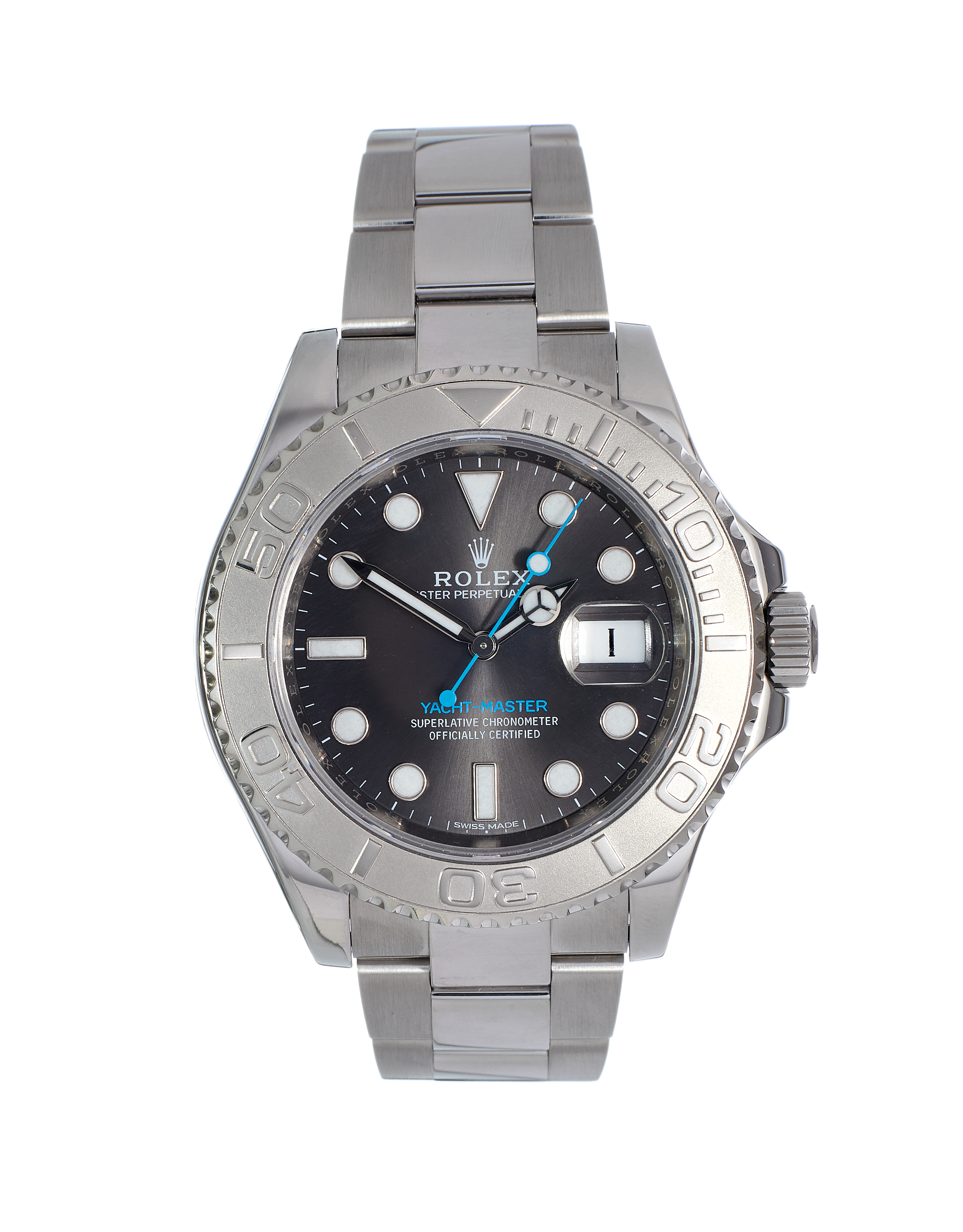 This Rolex Yacht-Master 116622 has a rhodium dial and a bracelet strap. This Rolex has undergone a thorough inspection of water resistance, accuracy, functionality and condition to determine the level of reconditioning required to meet our strict standards. It has also been referenced against technical documents and manufacturer records where available to ensure authenticity and a clean history. All our watches have a 24-month warranty for your peace of mind. One of our skilled polishing technicians has removed marks on the case and bracelet of this watch, brought about by daily wear and tear, which is why this watch does not come with the remaining manufacturer’s warranty.