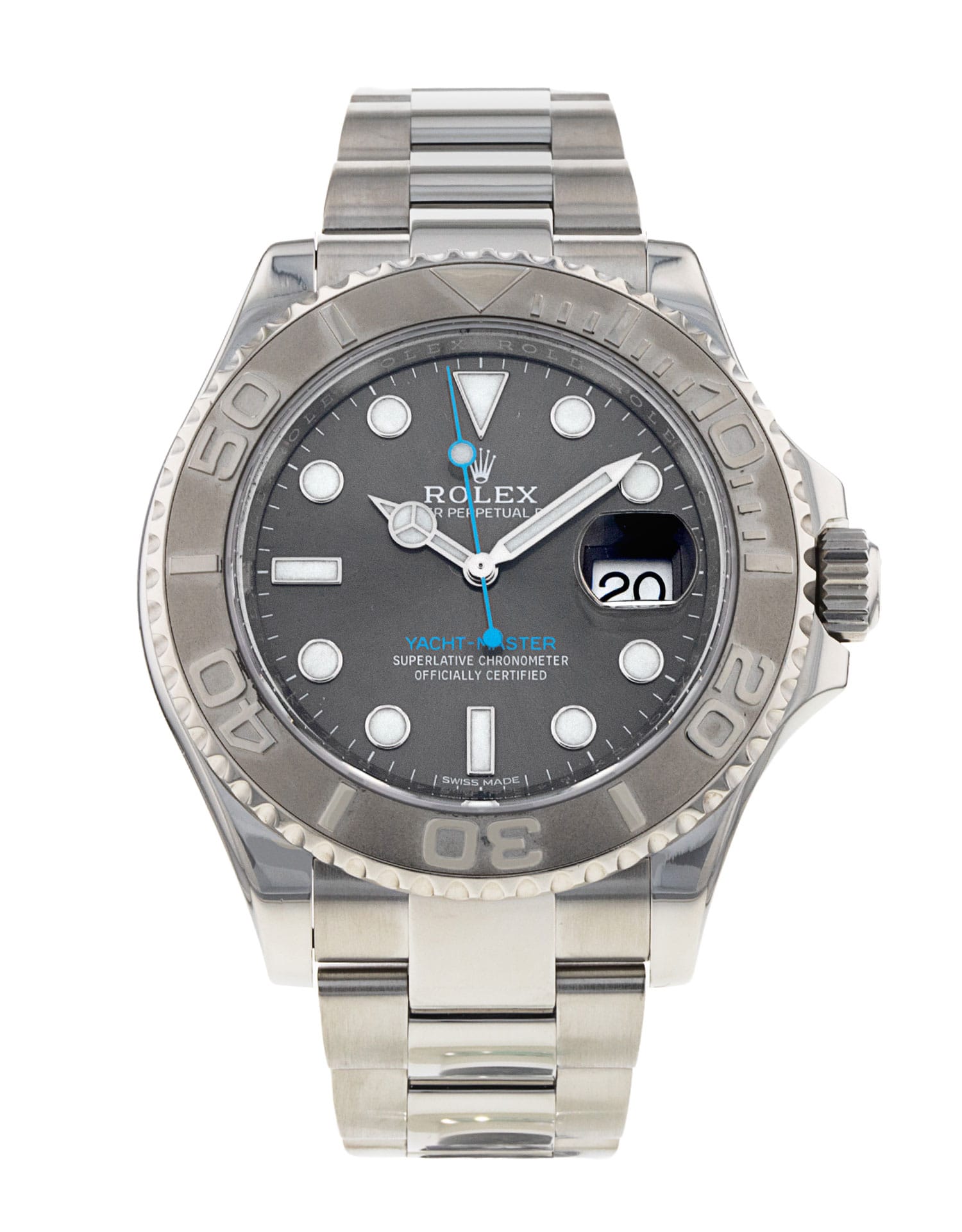 This Rolex Yacht-Master 116622 has a rhodium dial and a bracelet strap. This Rolex has undergone a thorough inspection of water resistance, accuracy, functionality and condition to determine the level of reconditioning required to meet our strict standards. It has also been referenced against technical documents and manufacturer records where available to ensure authenticity and a clean history. All our watches have a 24-month warranty for your peace of mind. One of our skilled polishing technicians has removed marks on the case and bracelet of this watch, brought about by daily wear and tear, which is why this watch does not come with the remaining manufacturer’s warranty.