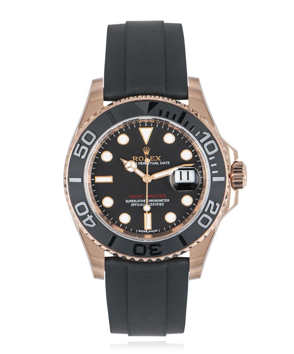 This Rolex Yacht-Master 116655 has a black dial and a rubber strap. This Rolex has undergone a thorough inspection of water resistance, accuracy, functionality and condition to determine the level of reconditioning required to meet our strict standards. It has also been referenced against technical documents and manufacturer records where available to ensure authenticity and a clean history. All our watches have a 24-month warranty for your peace of mind. One of our skilled polishing technicians has removed marks on the case and bracelet of this watch, brought about by daily wear and tear, which is why this watch does not come with the remaining manufacturer’s warranty.