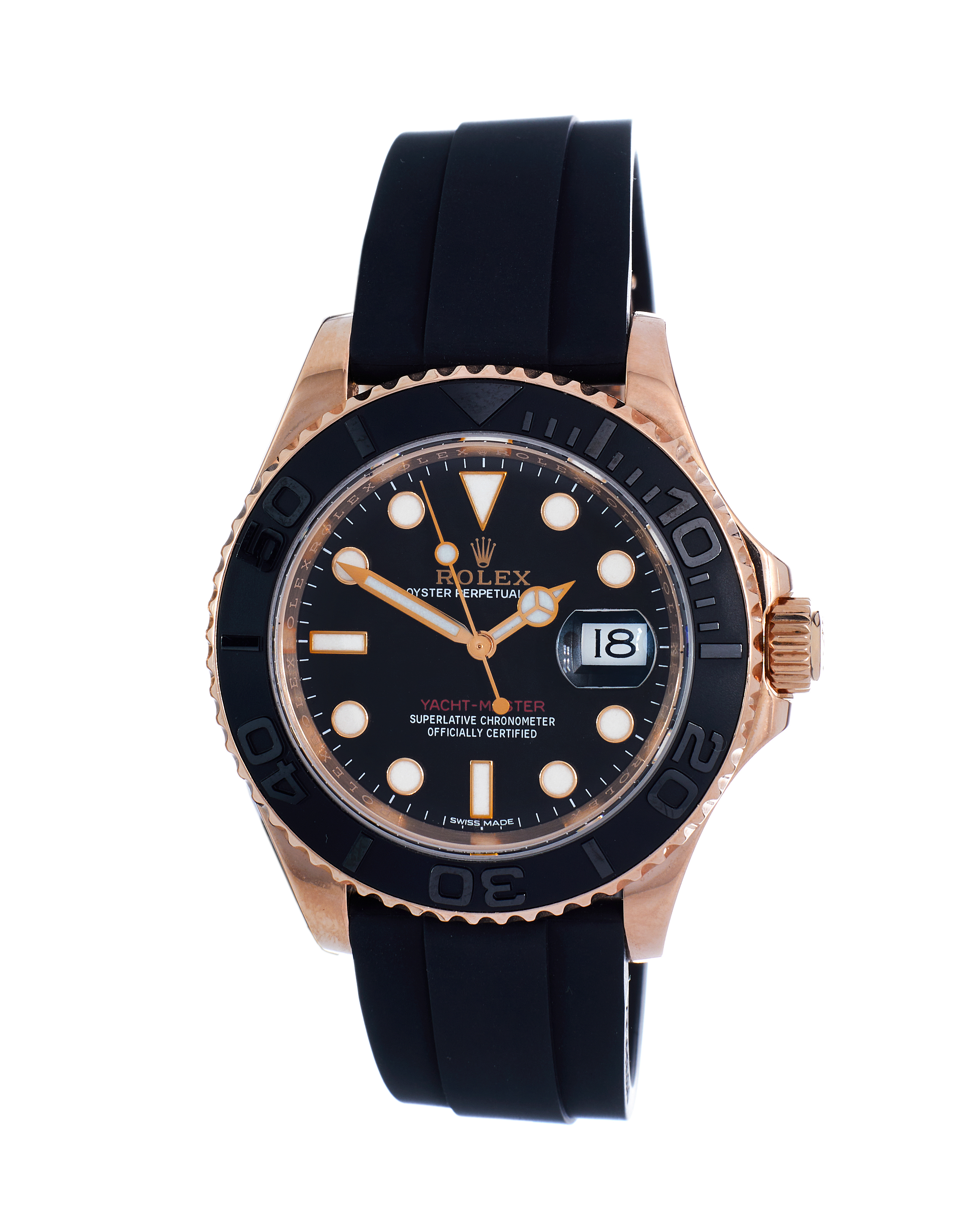 This Rolex Yacht-Master 116655 has a black dial and a rubber strap. This Rolex has undergone a thorough inspection of water resistance, accuracy, functionality and condition to determine the level of reconditioning required to meet our strict standards. It has also been referenced against technical documents and manufacturer records where available to ensure authenticity and a clean history. All our watches have a 24-month warranty for your peace of mind. One of our skilled polishing technicians has removed marks on the case and bracelet of this watch, brought about by daily wear and tear, which is why this watch does not come with the remaining manufacturer’s warranty.