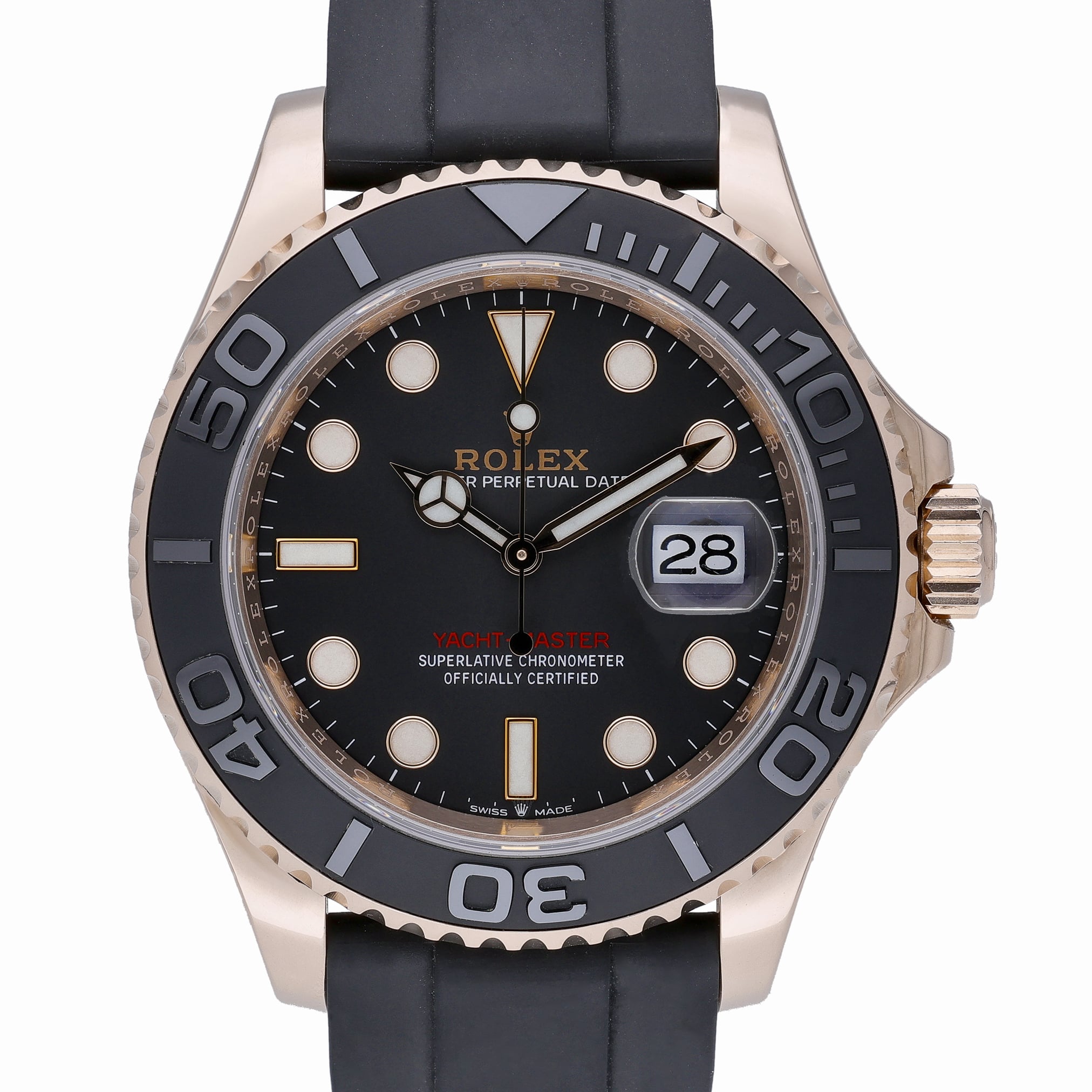 This Rolex Yacht-Master 126655 has a black dial and a rubber strap. This Rolex has undergone a thorough inspection of water resistance, accuracy, functionality and condition to determine the level of reconditioning required to meet our strict standards. It has also been referenced against technical documents and manufacturer records where available to ensure authenticity and a clean history. All our watches have a 24-month warranty for your peace of mind. One of our skilled polishing technicians has removed marks on the case and bracelet of this watch, brought about by daily wear and tear, which is why this watch does not come with the remaining manufacturer’s warranty.