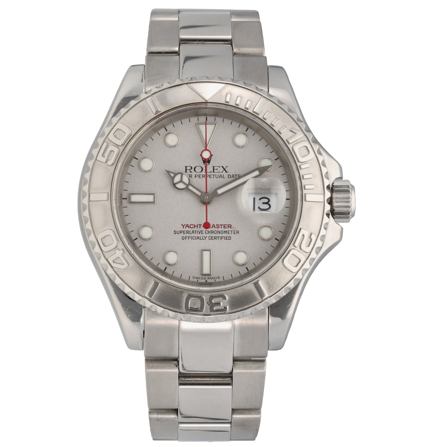 This Rolex Yacht-Master 16622 has a platinum dial and a bracelet strap. This Rolex has undergone a thorough inspection of water resistance, accuracy, functionality and condition to determine the level of reconditioning required to meet our strict standards. It has also been referenced against technical documents and manufacturer records where available to ensure authenticity and a clean history. All our watches have a 24-month warranty for your peace of mind. One of our skilled polishing technicians has removed marks on the case and bracelet of this watch, brought about by daily wear and tear, which is why this watch does not come with the remaining manufacturer’s warranty.