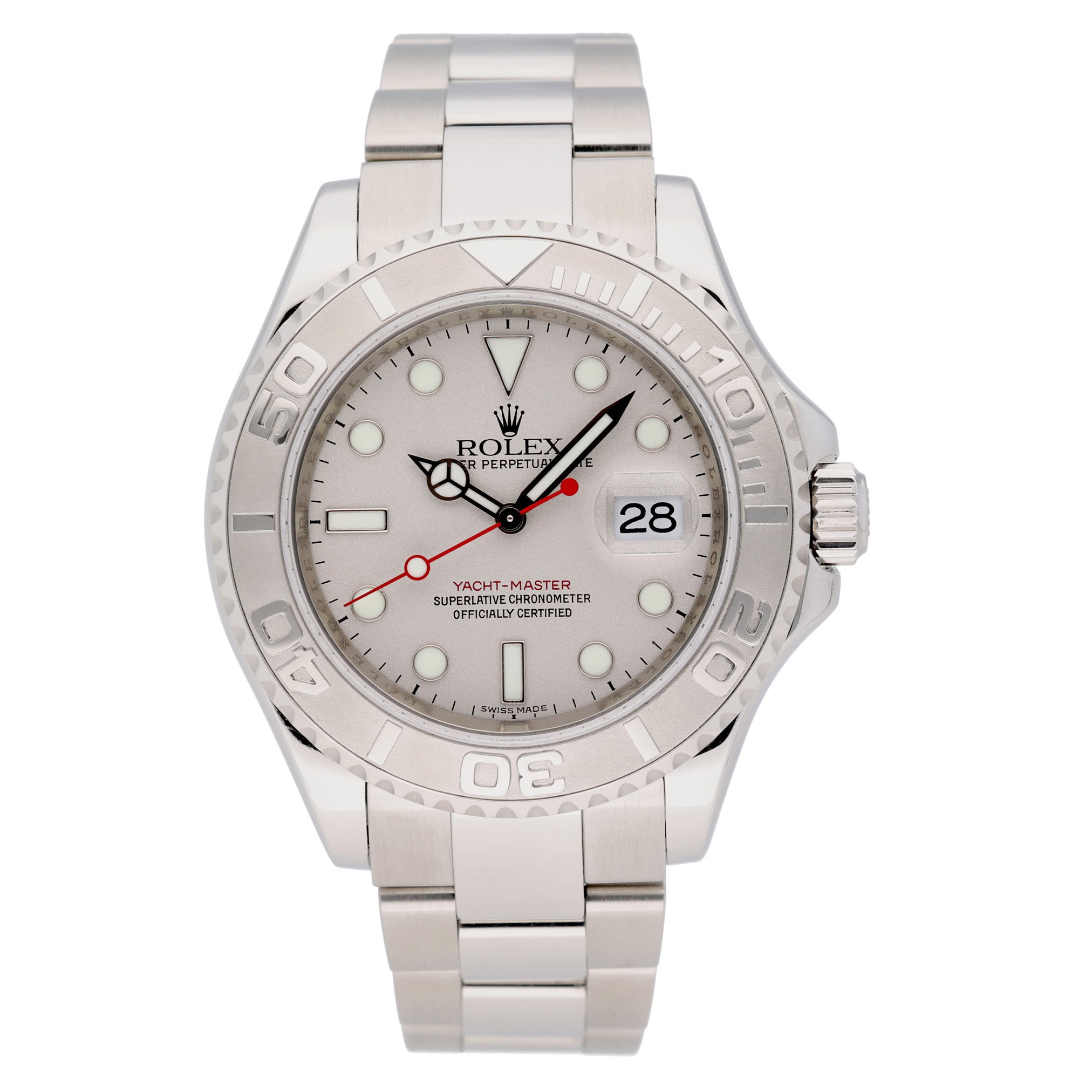 This Rolex Yacht-Master 16622 has a platinum dial and a bracelet strap. This Rolex has undergone a thorough inspection of water resistance, accuracy, functionality and condition to determine the level of reconditioning required to meet our strict standards. It has also been referenced against technical documents and manufacturer records where available to ensure authenticity and a clean history. All our watches have a 24-month warranty for your peace of mind. One of our skilled polishing technicians has removed marks on the case and bracelet of this watch, brought about by daily wear and tear, which is why this watch does not come with the remaining manufacturer’s warranty.