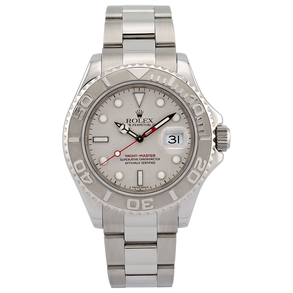 This Rolex Yacht-Master 16622 has a platinum dial and a bracelet strap. This Rolex has undergone a thorough inspection of water resistance, accuracy, functionality and condition to determine the level of reconditioning required to meet our strict standards. It has also been referenced against technical documents and manufacturer records where available to ensure authenticity and a clean history. All our watches have a 24-month warranty for your peace of mind. One of our skilled polishing technicians has removed marks on the case and bracelet of this watch, brought about by daily wear and tear, which is why this watch does not come with the remaining manufacturer’s warranty.