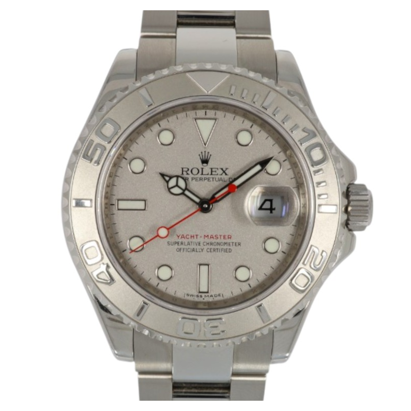This Rolex Yacht-Master 16622 has a platinum dial and a bracelet strap. This Rolex has undergone a thorough inspection of water resistance, accuracy, functionality and condition to determine the level of reconditioning required to meet our strict standards. It has also been referenced against technical documents and manufacturer records where available to ensure authenticity and a clean history. Our watches have a 24-month warranty for your peace of mind, in conjunction with any remaining manufacturer’s warranty from new or from service. To maintain the manufacturer’s warranty on this watch, it has not been polished in our service centre.