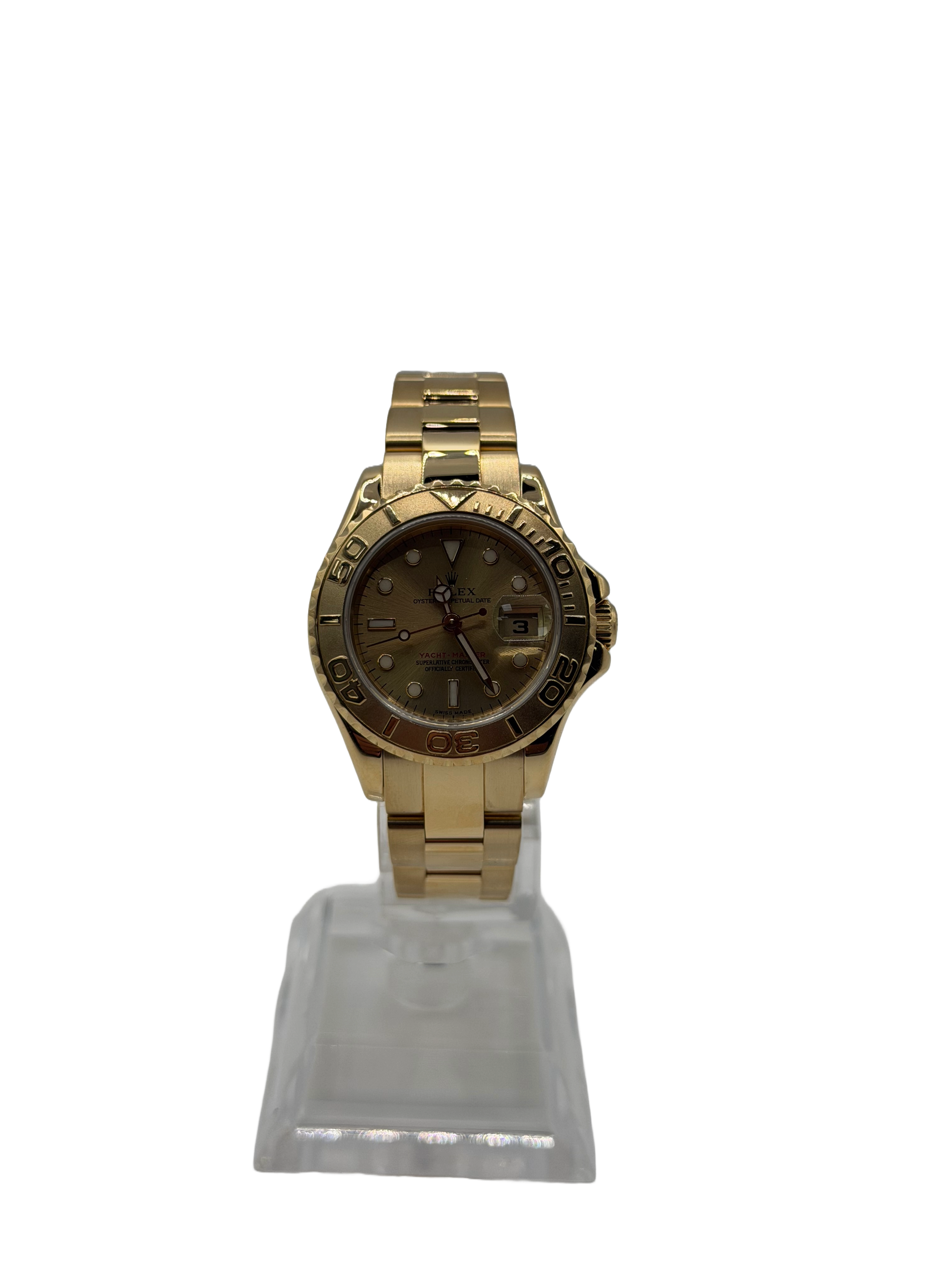 This Rolex Yacht-Master 169628 has a champagne dial and a bracelet strap. This Rolex has undergone a thorough inspection of water resistance, accuracy, functionality and condition to determine the level of reconditioning required to meet our strict standards. It has also been referenced against technical documents and manufacturer records where available to ensure authenticity and a clean history. All our watches have a 24-month warranty for your peace of mind. One of our skilled polishing technicians has removed marks on the case and bracelet of this watch, brought about by daily wear and tear, which is why this watch does not come with the remaining manufacturer’s warranty.