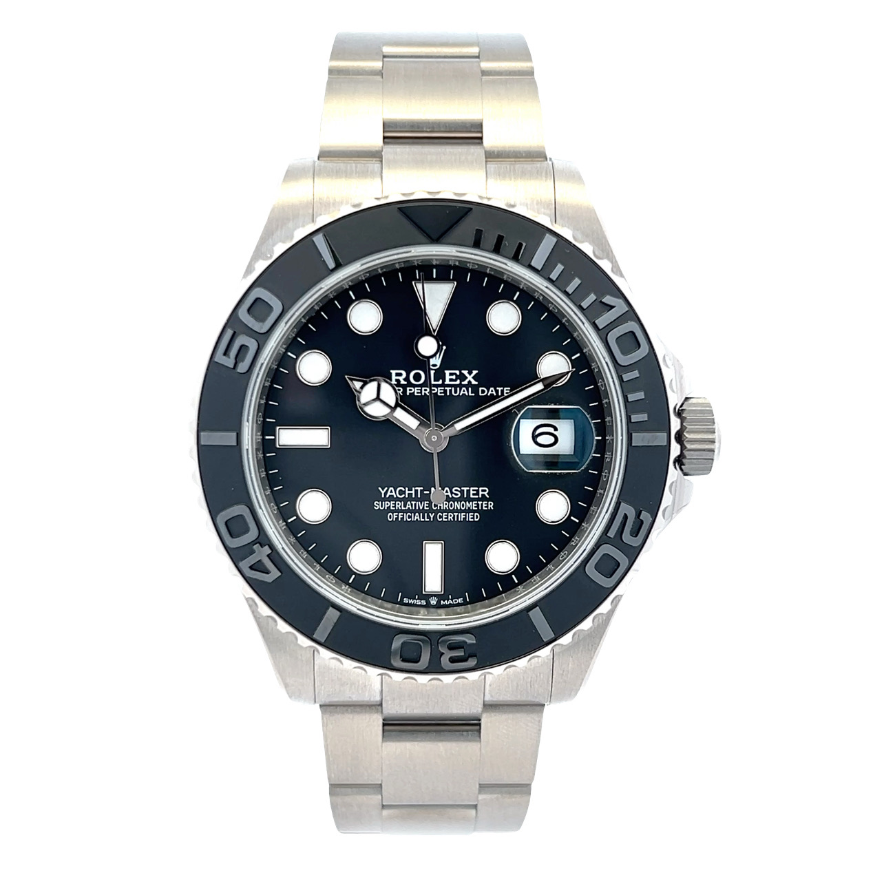 This Rolex Yacht-Master 226627 has a black dial and a bracelet strap. This Rolex has undergone a thorough inspection of water resistance, accuracy, functionality and condition to determine the level of reconditioning required to meet our strict standards. It has also been referenced against technical documents and manufacturer records where available to ensure authenticity and a clean history. Our watches have a 24-month warranty for your peace of mind, in conjunction with any remaining manufacturer’s warranty from new or from service. To maintain the manufacturer’s warranty on this watch, it has not been polished in our service centre.