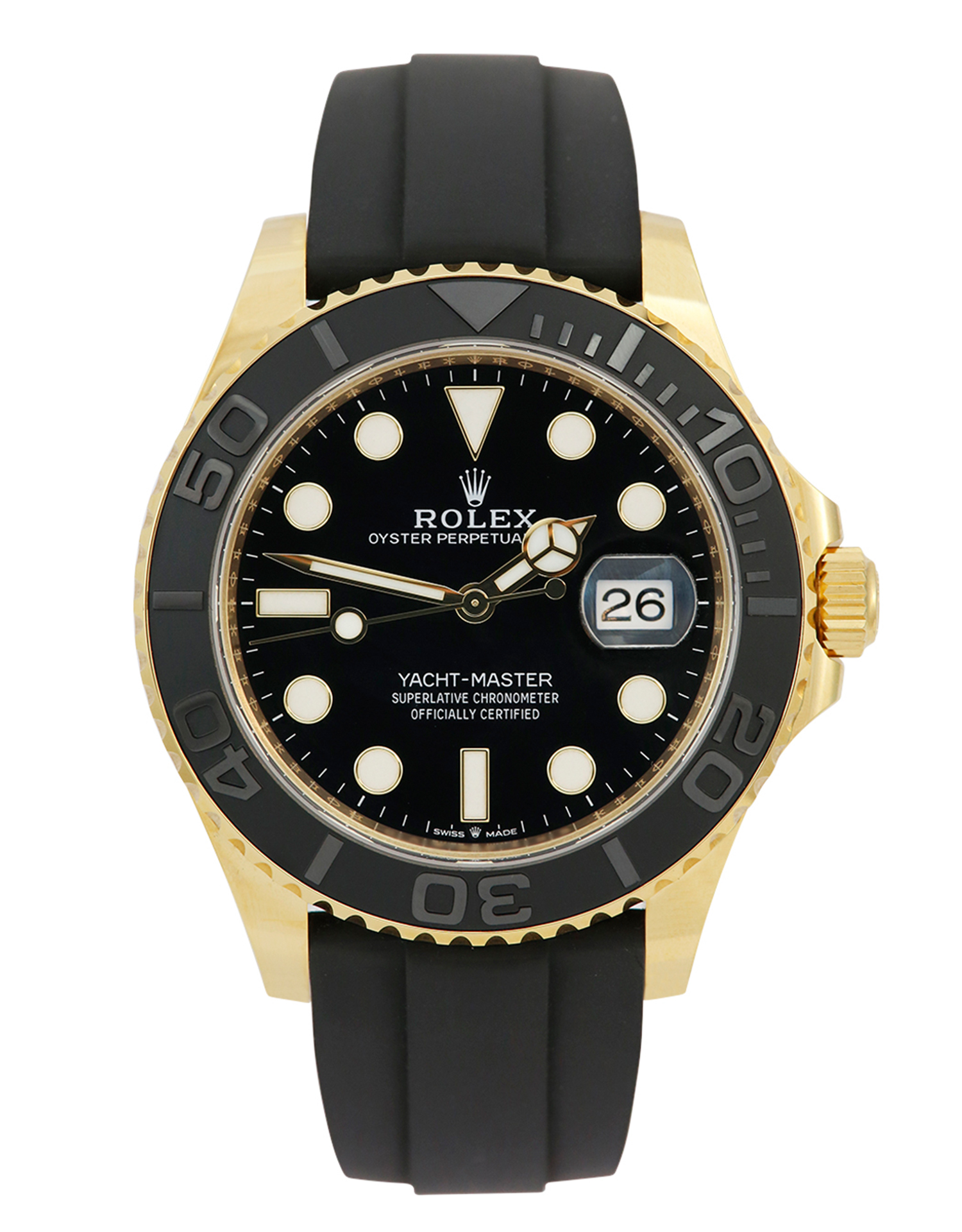 This Rolex Yacht-Master 226658 has a black dial and a rubber strap. This Rolex has undergone a thorough inspection of water resistance, accuracy, functionality and condition to determine the level of reconditioning required to meet our strict standards. It has also been referenced against technical documents and manufacturer records where available to ensure authenticity and a clean history. Our watches have a 24-month warranty for your peace of mind, in conjunction with any remaining manufacturer’s warranty from new or from service. To maintain the manufacturer’s warranty on this watch, it has not been polished in our service centre.