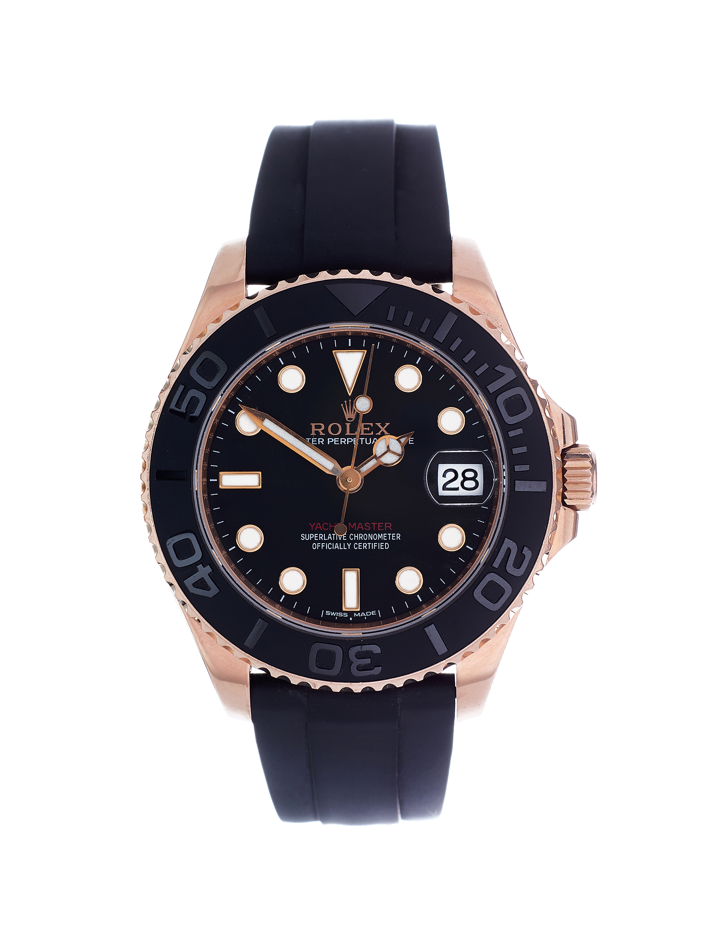 This Rolex Yacht-Master 268655 has a black dial and a rubber strap. This Rolex has undergone a thorough inspection of water resistance, accuracy, functionality and condition to determine the level of reconditioning required to meet our strict standards. It has also been referenced against technical documents and manufacturer records where available to ensure authenticity and a clean history. All our watches have a 24-month warranty for your peace of mind. One of our skilled polishing technicians has removed marks on the case and bracelet of this watch, brought about by daily wear and tear, which is why this watch does not come with the remaining manufacturer’s warranty.