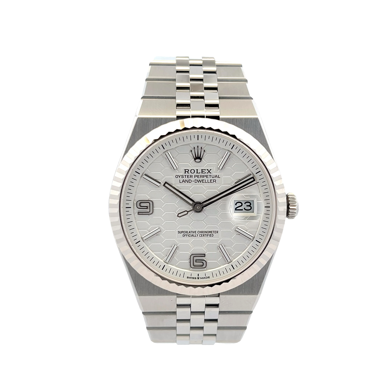 This Rolex Land-Dweller 40 127334 has a white honeycomb dial and a bracelet strap. This Rolex has undergone a thorough inspection of water resistance, accuracy, functionality and condition to determine the level of reconditioning required to meet our strict standards. It has also been referenced against technical documents and manufacturer records where available to ensure authenticity and a clean history. Our watches have a 24-month warranty for your peace of mind, in conjunction with any remaining manufacturer’s warranty from new or from service. To maintain the manufacturer’s warranty on this watch, it has not been polished in our service centre.