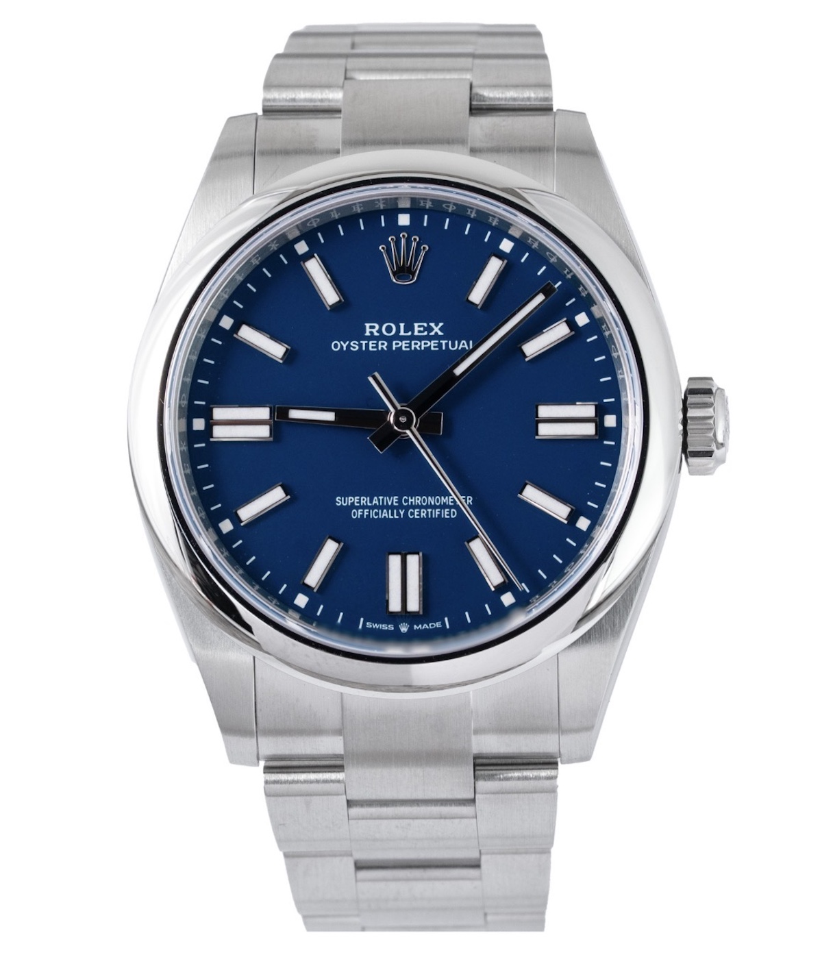 This Rolex Oyster Perpetual 41 134300 has a blue dial and a bracelet strap. This Rolex has undergone a thorough inspection of water resistance, accuracy, functionality and condition to determine the level of reconditioning required to meet our strict standards. It has also been referenced against technical documents and manufacturer records where available to ensure authenticity and a clean history. Our watches have a 24-month warranty for your peace of mind, in conjunction with any remaining manufacturer’s warranty from new or from service. To maintain the manufacturer’s warranty on this watch, it has not been polished in our service centre.