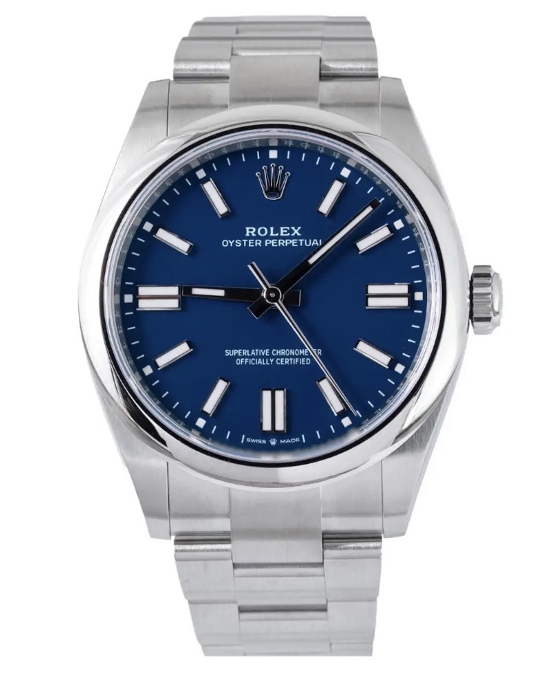This Rolex Oyster Perpetual 41 134300 has a blue dial and a bracelet strap. This Rolex has undergone a thorough inspection of water resistance, accuracy, functionality and condition to determine the level of reconditioning required to meet our strict standards. It has also been referenced against technical documents and manufacturer records where available to ensure authenticity and a clean history. Our watches have a 24-month warranty for your peace of mind, in conjunction with any remaining manufacturer’s warranty from new or from service. To maintain the manufacturer’s warranty on this watch, it has not been polished in our service centre.