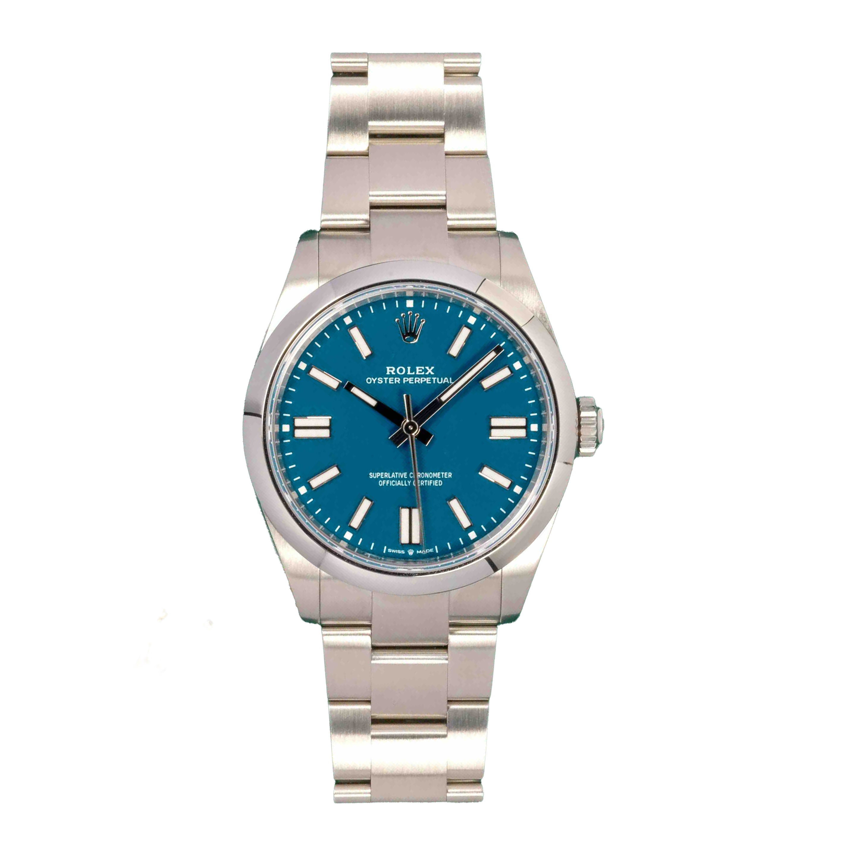 This Rolex Oyster Perpetual 41 134300 has a blue dial and a bracelet strap. This Rolex has undergone a thorough inspection of water resistance, accuracy, functionality and condition to determine the level of reconditioning required to meet our strict standards. It has also been referenced against technical documents and manufacturer records where available to ensure authenticity and a clean history. Our watches have a 24-month warranty for your peace of mind, in conjunction with any remaining manufacturer’s warranty from new or from service. To maintain the manufacturer’s warranty on this watch, it has not been polished in our service centre.
