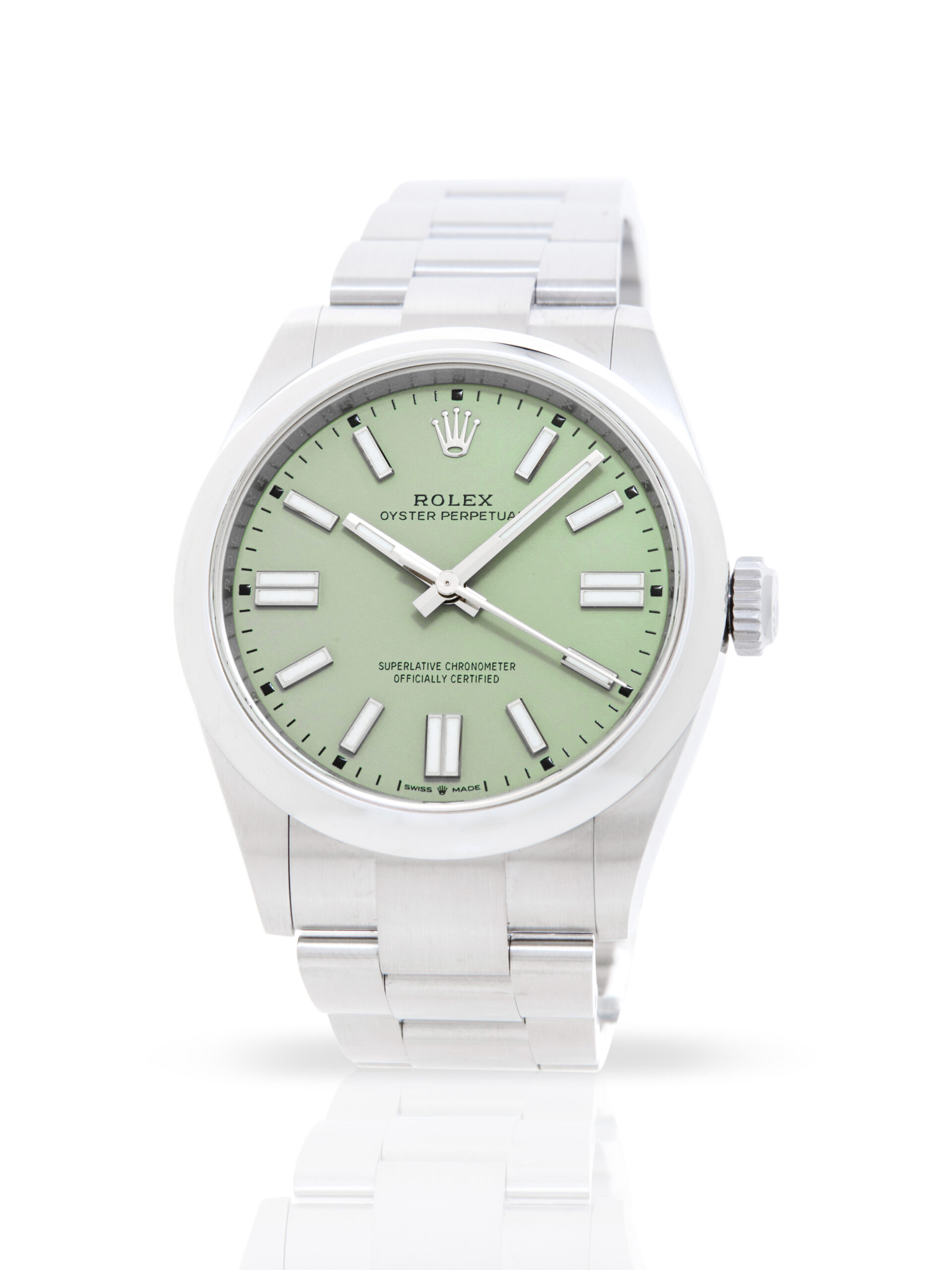 This Rolex Oyster Perpetual 41 134300 has a pistachio dial and a bracelet strap. This Rolex has undergone a thorough inspection of water resistance, accuracy, functionality and condition to determine the level of reconditioning required to meet our strict standards. It has also been referenced against technical documents and manufacturer records where available to ensure authenticity and a clean history. Our watches have a 24-month warranty for your peace of mind, in conjunction with any remaining manufacturer’s warranty from new or from service. To maintain the manufacturer’s warranty on this watch, it has not been polished in our service centre.