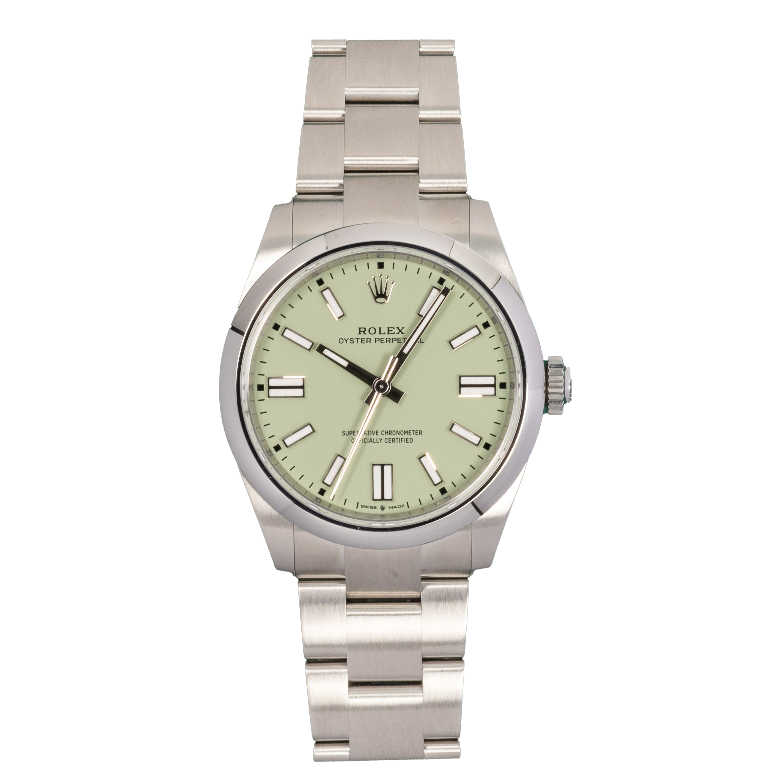 This Rolex Oyster Perpetual 41 134300 has a pistachio dial and a bracelet strap. This Rolex has undergone a thorough inspection of water resistance, accuracy, functionality and condition to determine the level of reconditioning required to meet our strict standards. It has also been referenced against technical documents and manufacturer records where available to ensure authenticity and a clean history. Our watches have a 24-month warranty for your peace of mind, in conjunction with any remaining manufacturer’s warranty from new or from service. To maintain the manufacturer’s warranty on this watch, it has not been polished in our service centre.