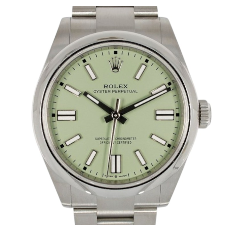 This Rolex Oyster Perpetual 41 134300 has a pistachio dial and a bracelet strap. This Rolex has undergone a thorough inspection of water resistance, accuracy, functionality and condition to determine the level of reconditioning required to meet our strict standards. It has also been referenced against technical documents and manufacturer records where available to ensure authenticity and a clean history. Our watches have a 24-month warranty for your peace of mind, in conjunction with any remaining manufacturer’s warranty from new or from service. To maintain the manufacturer’s warranty on this watch, it has not been polished in our service centre.