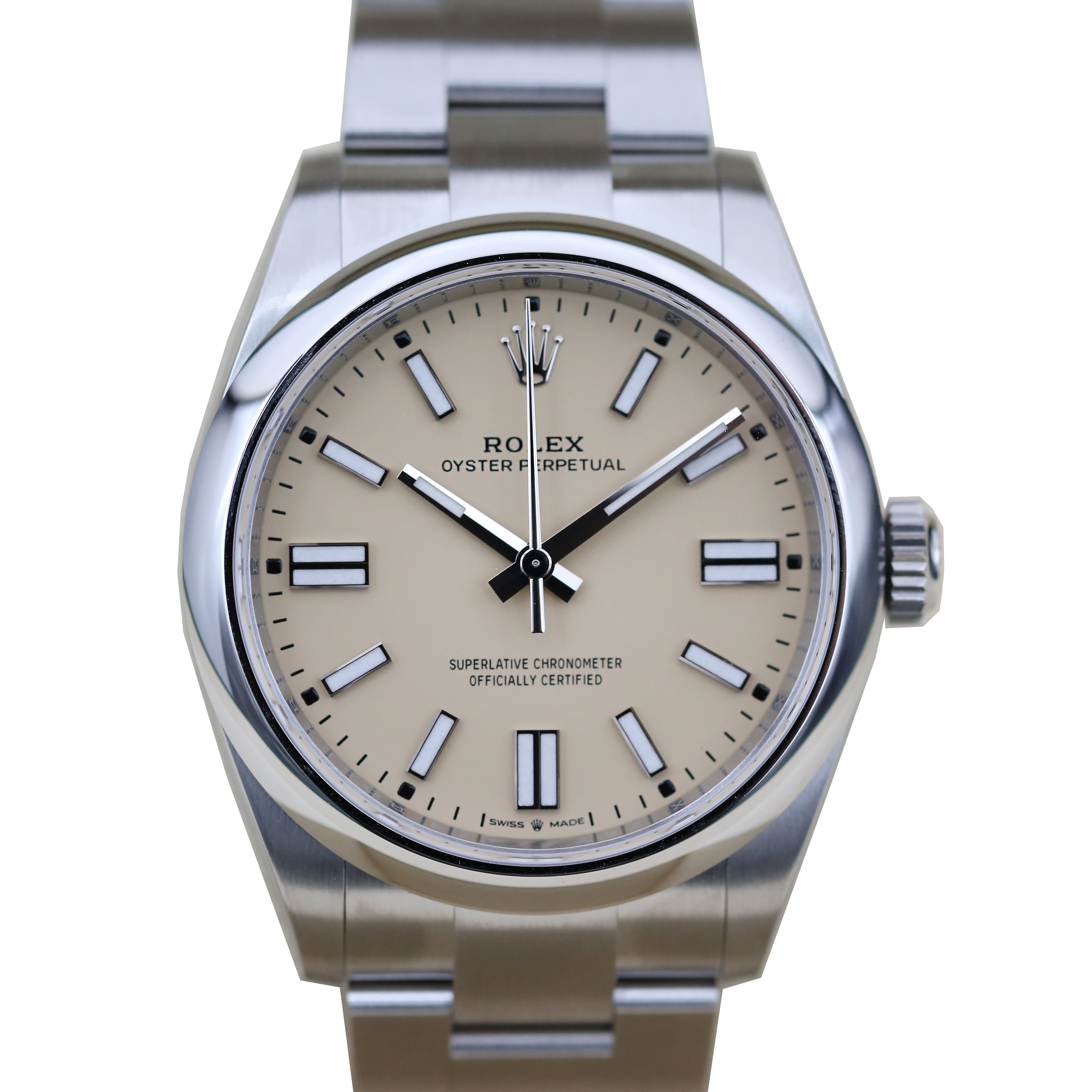 This Rolex Oyster Perpetual 41 134300 has a beige dial and a bracelet strap. This Rolex has undergone a thorough inspection of water resistance, accuracy, functionality and condition to determine the level of reconditioning required to meet our strict standards. It has also been referenced against technical documents and manufacturer records where available to ensure authenticity and a clean history. Our watches have a 24-month warranty for your peace of mind, in conjunction with any remaining manufacturer’s warranty from new or from service. To maintain the manufacturer’s warranty on this watch, it has not been polished in our service centre.