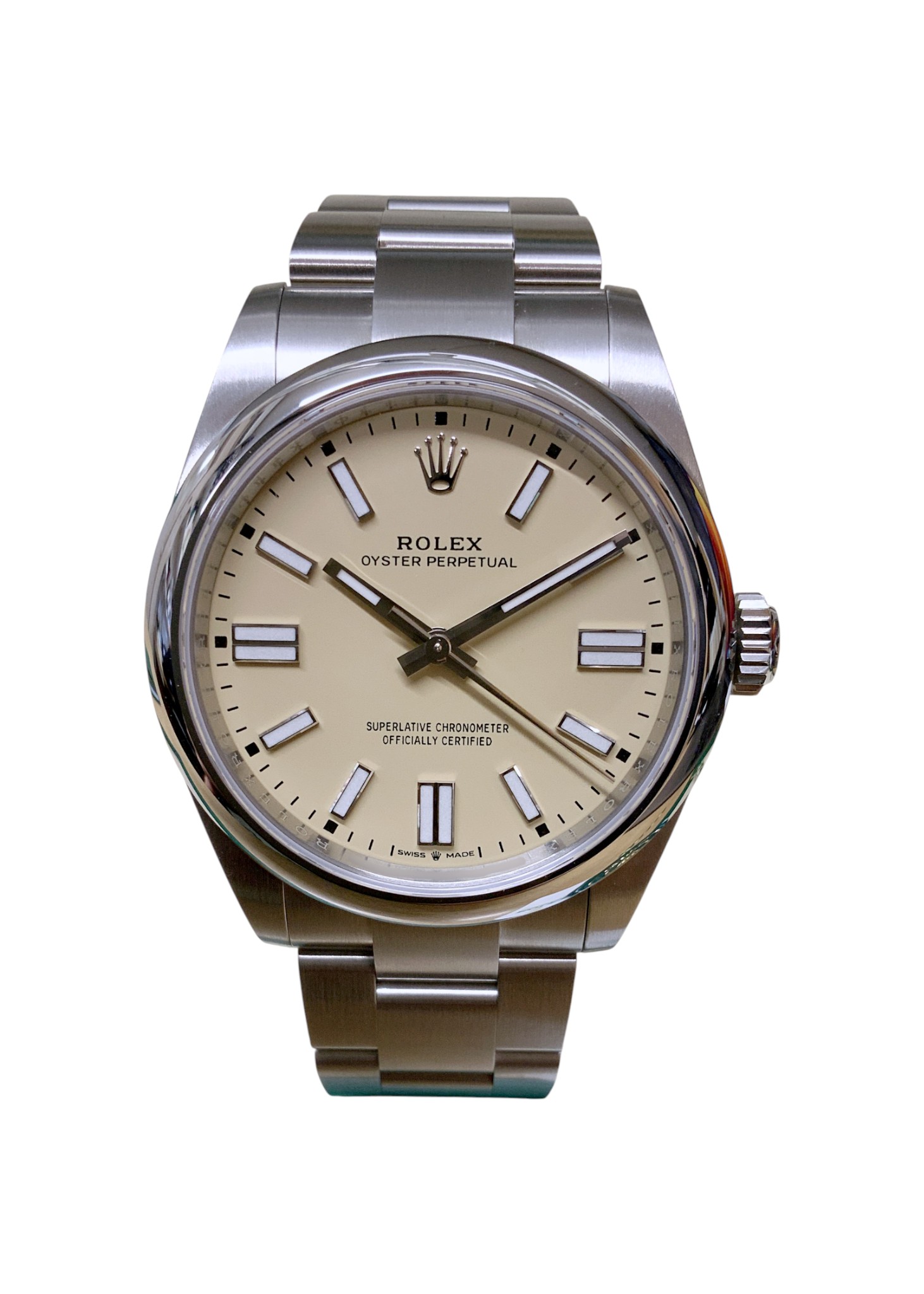 This Rolex Oyster Perpetual 41 134300 has a beige dial and a bracelet strap. This Rolex has undergone a thorough inspection of water resistance, accuracy, functionality and condition to determine the level of reconditioning required to meet our strict standards. It has also been referenced against technical documents and manufacturer records where available to ensure authenticity and a clean history. Our watches have a 24-month warranty for your peace of mind, in conjunction with any remaining manufacturer’s warranty from new or from service. To maintain the manufacturer’s warranty on this watch, it has not been polished in our service centre.