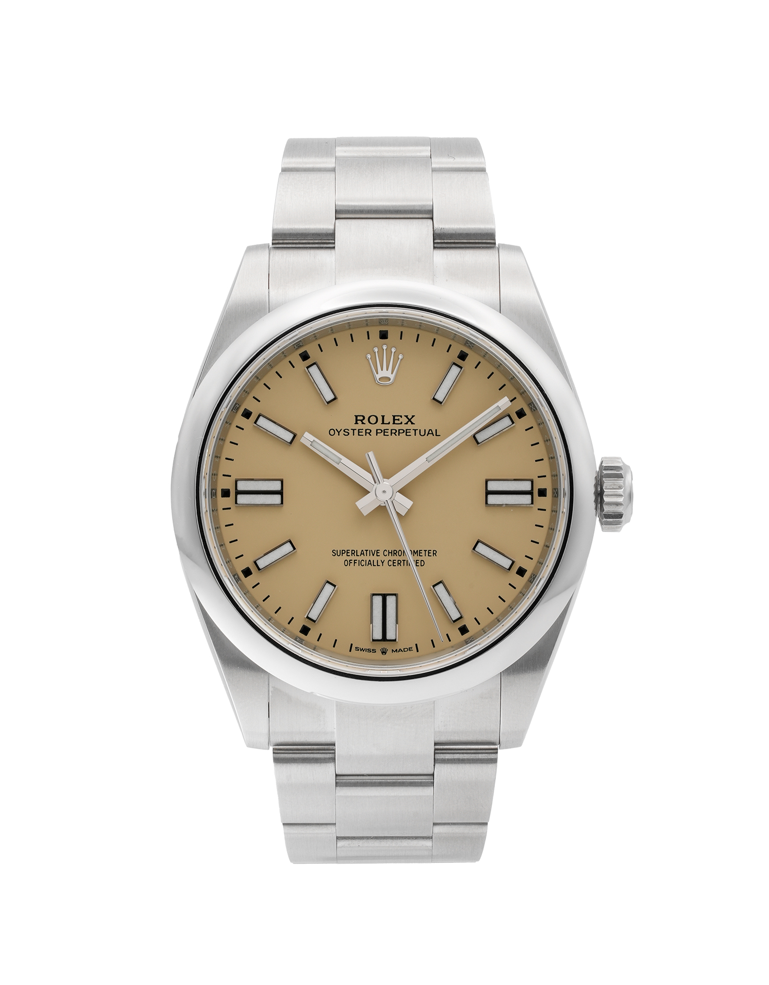This Rolex Oyster Perpetual 41 134300 has a beige dial and a bracelet strap. This Rolex has undergone a thorough inspection of water resistance, accuracy, functionality and condition to determine the level of reconditioning required to meet our strict standards. It has also been referenced against technical documents and manufacturer records where available to ensure authenticity and a clean history. Our watches have a 24-month warranty for your peace of mind, in conjunction with any remaining manufacturer’s warranty from new or from service. To maintain the manufacturer’s warranty on this watch, it has not been polished in our service centre.