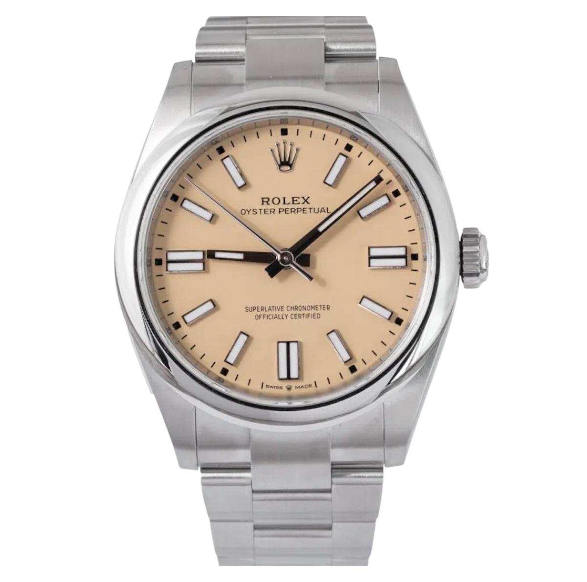 This Rolex Oyster Perpetual 41 134300 has a beige dial and a bracelet strap. This Rolex has undergone a thorough inspection of water resistance, accuracy, functionality and condition to determine the level of reconditioning required to meet our strict standards. It has also been referenced against technical documents and manufacturer records where available to ensure authenticity and a clean history. Our watches have a 24-month warranty for your peace of mind, in conjunction with any remaining manufacturer’s warranty from new or from service. To maintain the manufacturer’s warranty on this watch, it has not been polished in our service centre.