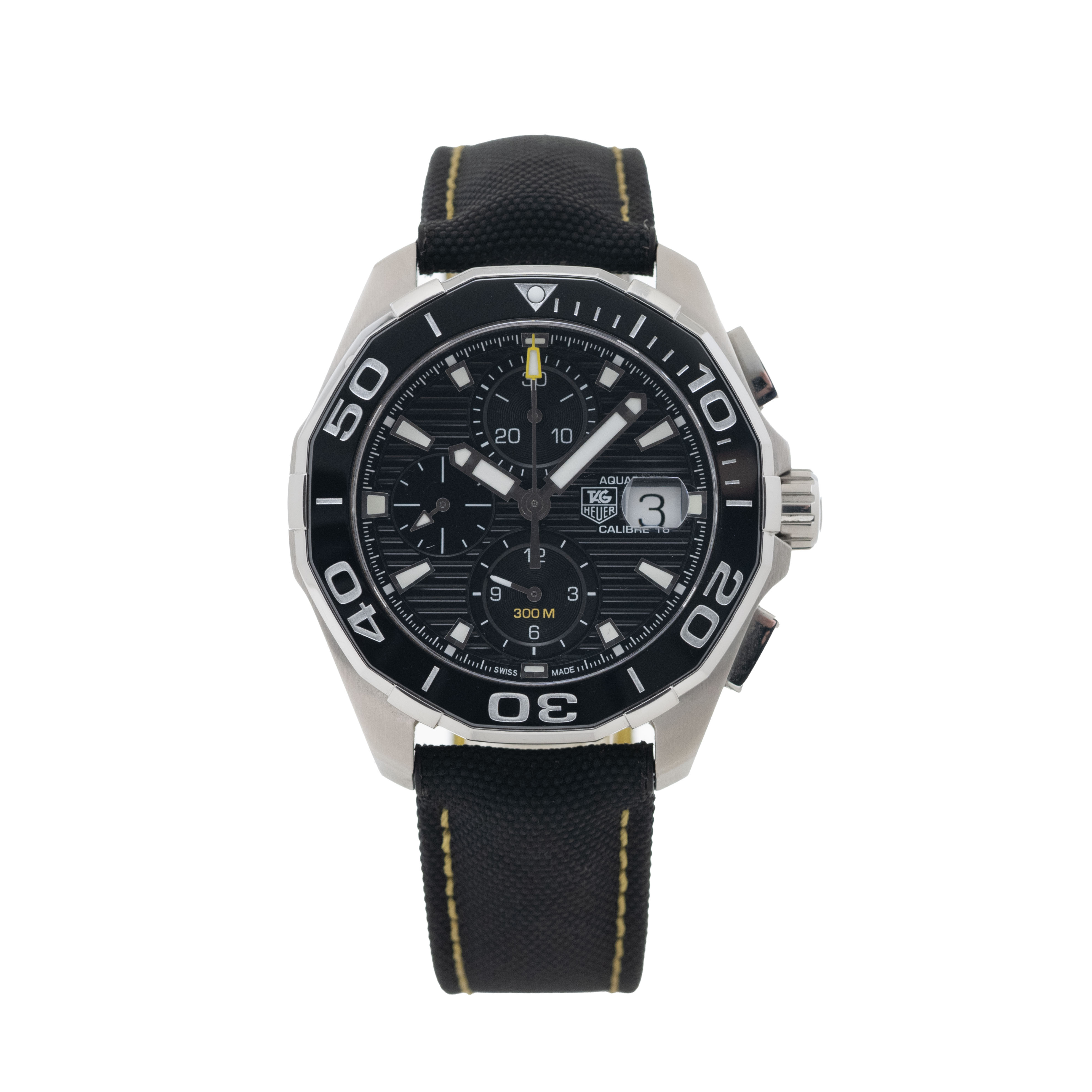 This Tag Heuer Aquaracer CAY211A.FC6361 has a black baton dial and a fabric strap. This Tag Heuer has undergone a thorough inspection of accuracy, functionality and condition at our Tag Heuer certified service centre to determine the level of reconditioning required to meet our strict standards. It has also been checked against our records to ensure authenticity. All our watches have a 24-month warranty for your peace of mind.