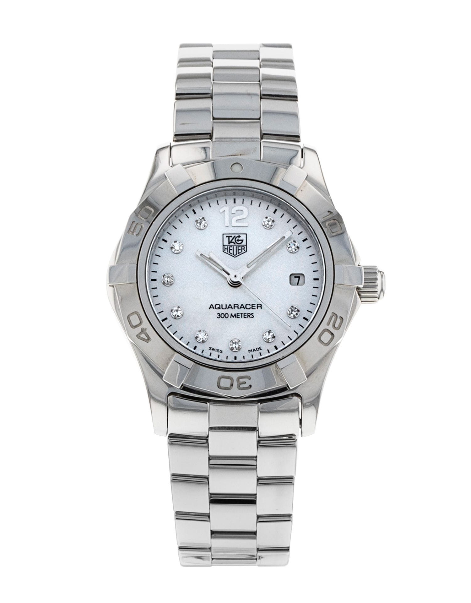 This Tag Heuer Aquaracer WAF1415.BA0813 has a mother of pearl white - diamond dial and a bracelet strap. This Tag Heuer has undergone a thorough inspection of accuracy, functionality and condition at our Tag Heuer certified service centre to determine the level of reconditioning required to meet our strict standards. It has also been checked against our records to ensure authenticity. All our watches have a 24-month warranty for your peace of mind.