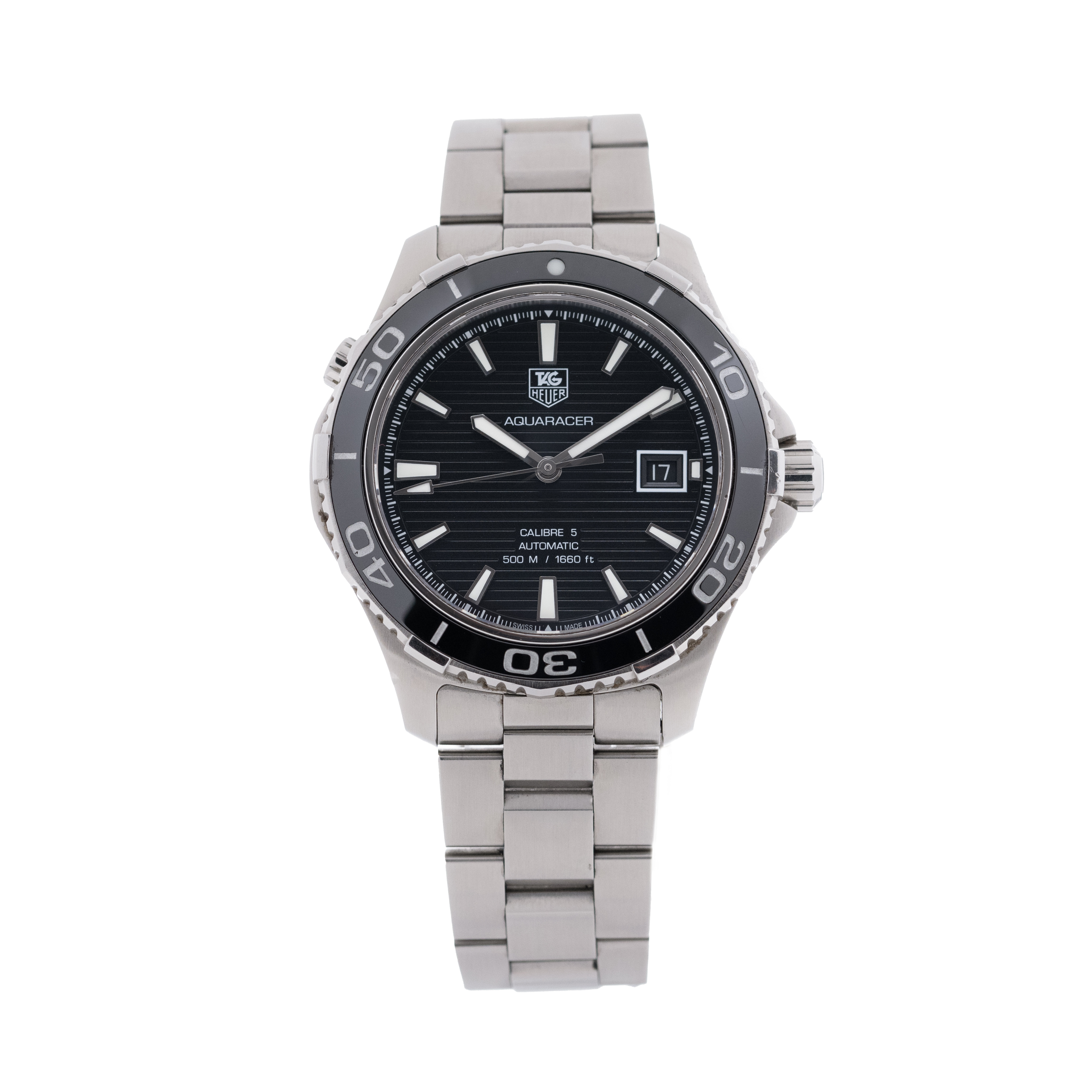 This Tag Heuer Aquaracer WAK2110.BA0830 has a black baton dial and a bracelet strap. This Tag Heuer has undergone a thorough inspection of accuracy, functionality and condition at our Tag Heuer certified service centre to determine the level of reconditioning required to meet our strict standards. It has also been checked against our records to ensure authenticity. All our watches have a 24-month warranty for your peace of mind.