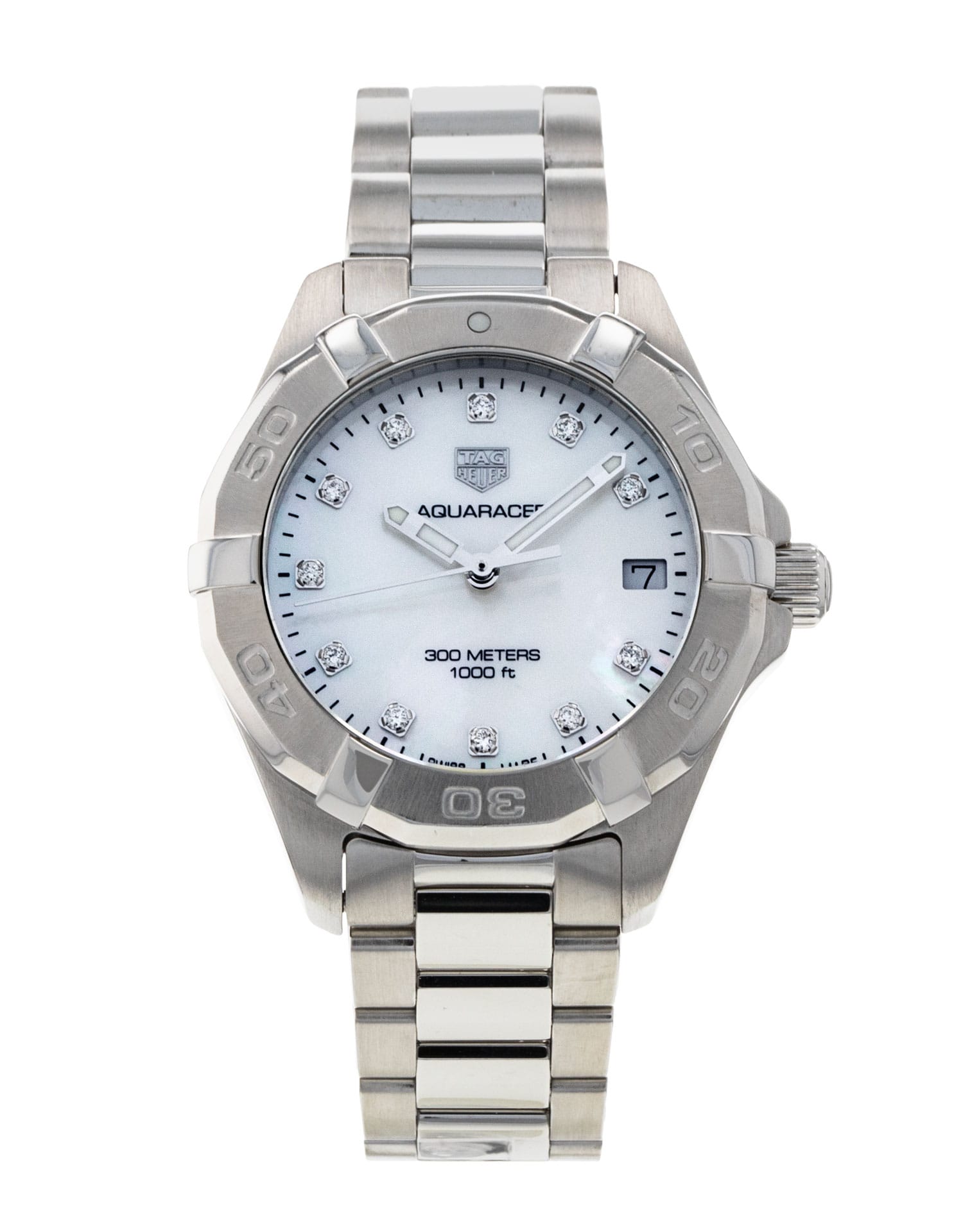 This Tag Heuer Aquaracer WBD1314.BA0740 has a mother of pearl white - diamond dial and a bracelet strap. This Tag Heuer has undergone a thorough inspection of accuracy, functionality and condition at our Tag Heuer certified service centre to determine the level of reconditioning required to meet our strict standards. It has also been checked against our records to ensure authenticity. All our watches have a 24-month warranty for your peace of mind.