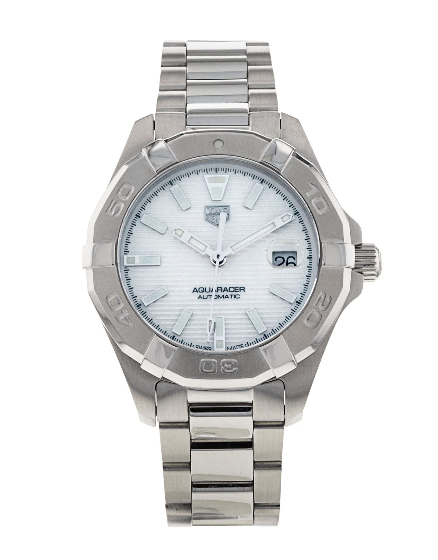 This Tag Heuer Aquaracer WBD2311.BA0740 has a mother of pearl white baton dial and a bracelet strap. This Tag Heuer has undergone a thorough inspection of accuracy, functionality and condition at our Tag Heuer certified service centre to determine the level of reconditioning required to meet our strict standards. It has also been checked against our records to ensure authenticity. All our watches have a 24-month warranty for your peace of mind.