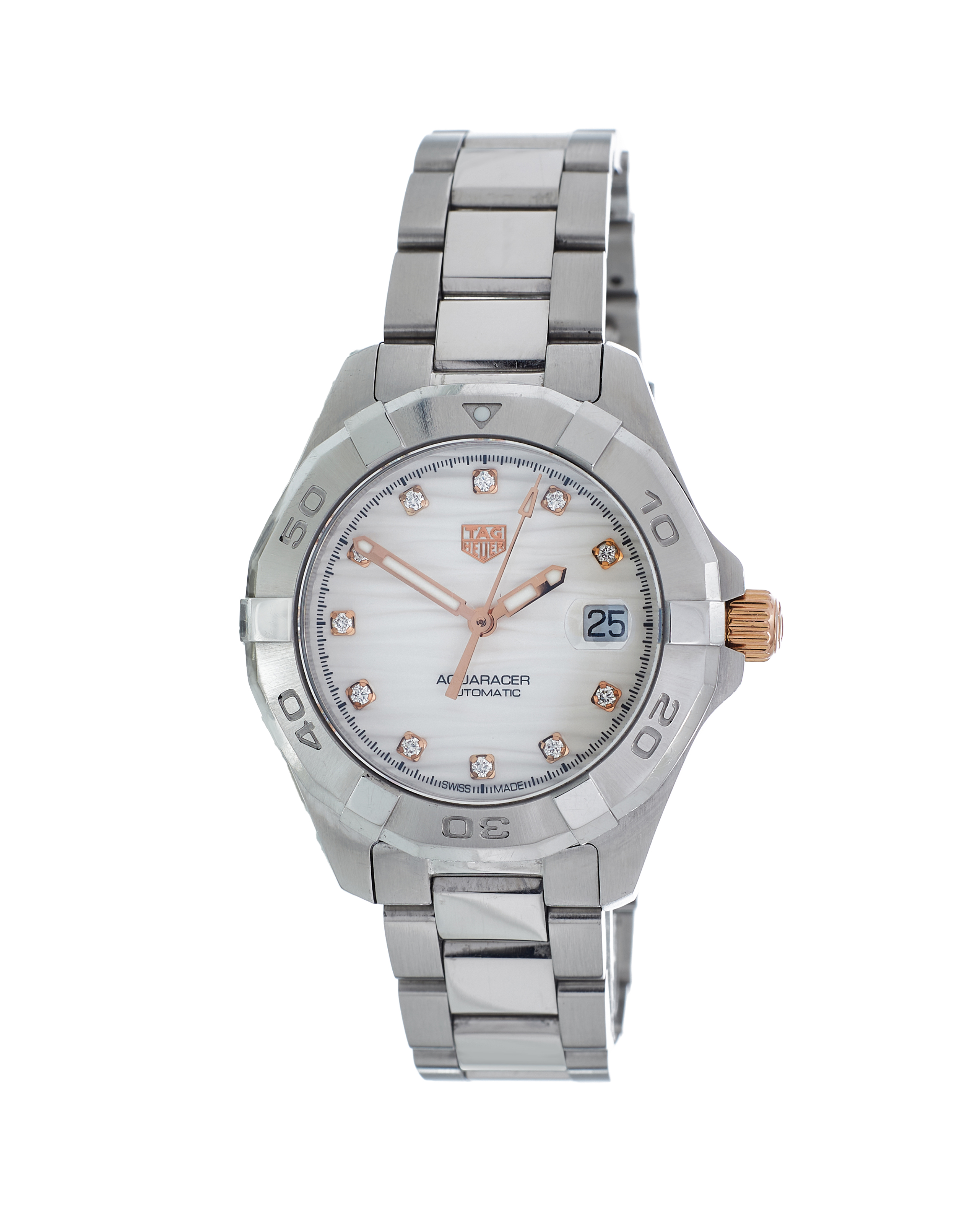 This Tag Heuer Aquaracer WBD2320.BA0740 has a silver diamond dial and a bracelet strap. This Tag Heuer has undergone a thorough inspection of accuracy, functionality and condition at our Tag Heuer certified service centre to determine the level of reconditioning required to meet our strict standards. It has also been checked against our records to ensure authenticity. All our watches have a 24-month warranty for your peace of mind.