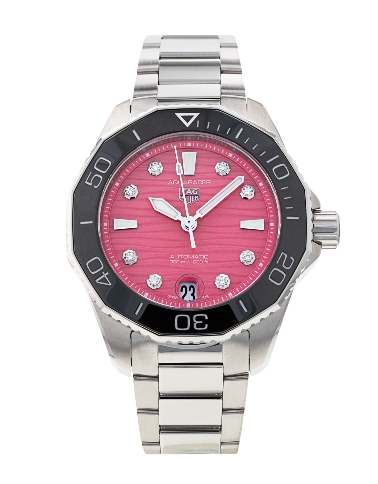 This Tag Heuer Aquaracer WBP231J.BA0618 has a pink diamond dial and a bracelet strap. This Tag Heuer has undergone a thorough inspection of accuracy, functionality and condition at our Tag Heuer certified service centre to determine the level of reconditioning required to meet our strict standards. It has also been checked against our records to ensure authenticity. All our watches have a 24-month warranty for your peace of mind.