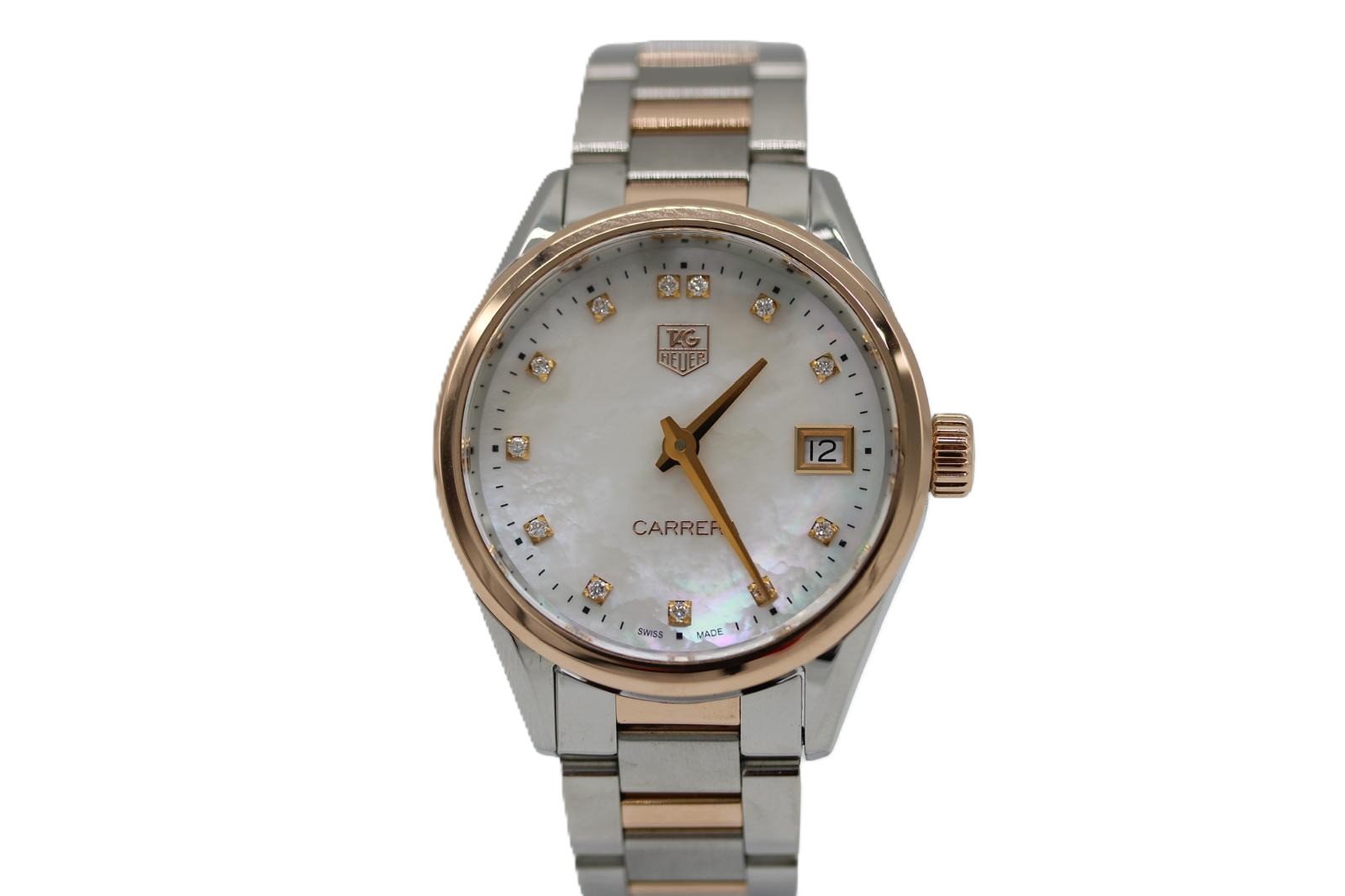 This Tag Heuer Carrera Ladies WAR1352.BD0774 has a mother of pearl white - diamond dial and a bracelet strap. This Tag Heuer has undergone a thorough inspection of accuracy, functionality and condition at our Tag Heuer certified service centre to determine the level of reconditioning required to meet our strict standards. It has also been checked against our records to ensure authenticity. All our watches have a 24-month warranty for your peace of mind.