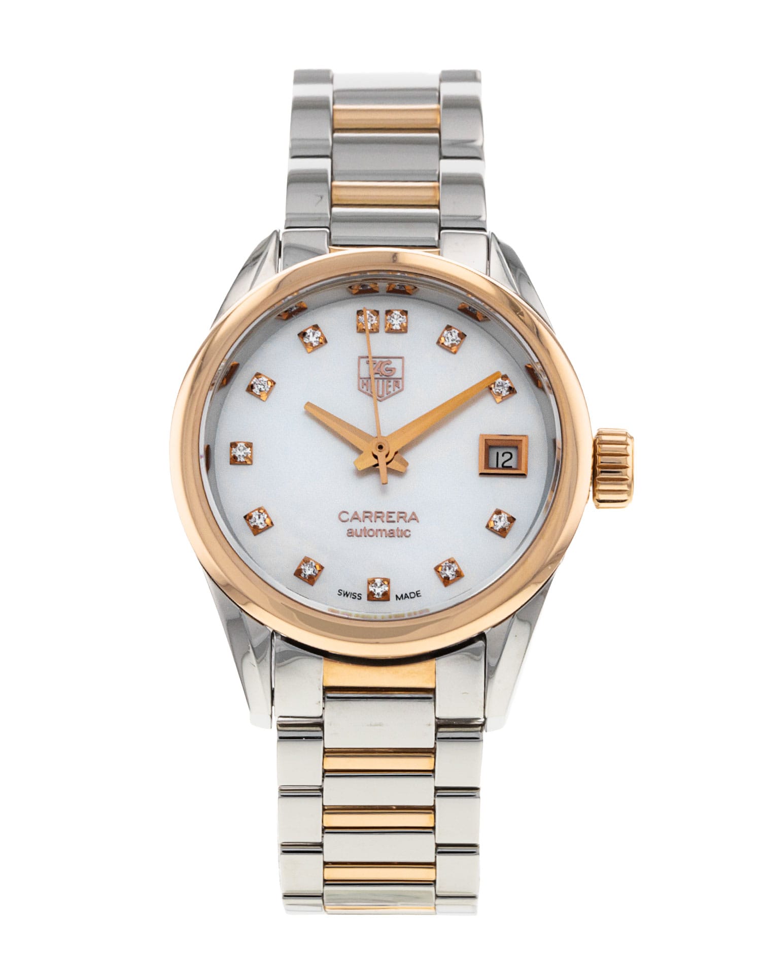 This Tag Heuer Carrera Ladies WAR2452.BD0777 has a mother of pearl white - diamond dial and a bracelet strap. This Tag Heuer has undergone a thorough inspection of accuracy, functionality and condition at our Tag Heuer certified service centre to determine the level of reconditioning required to meet our strict standards. It has also been checked against our records to ensure authenticity. All our watches have a 24-month warranty for your peace of mind.
