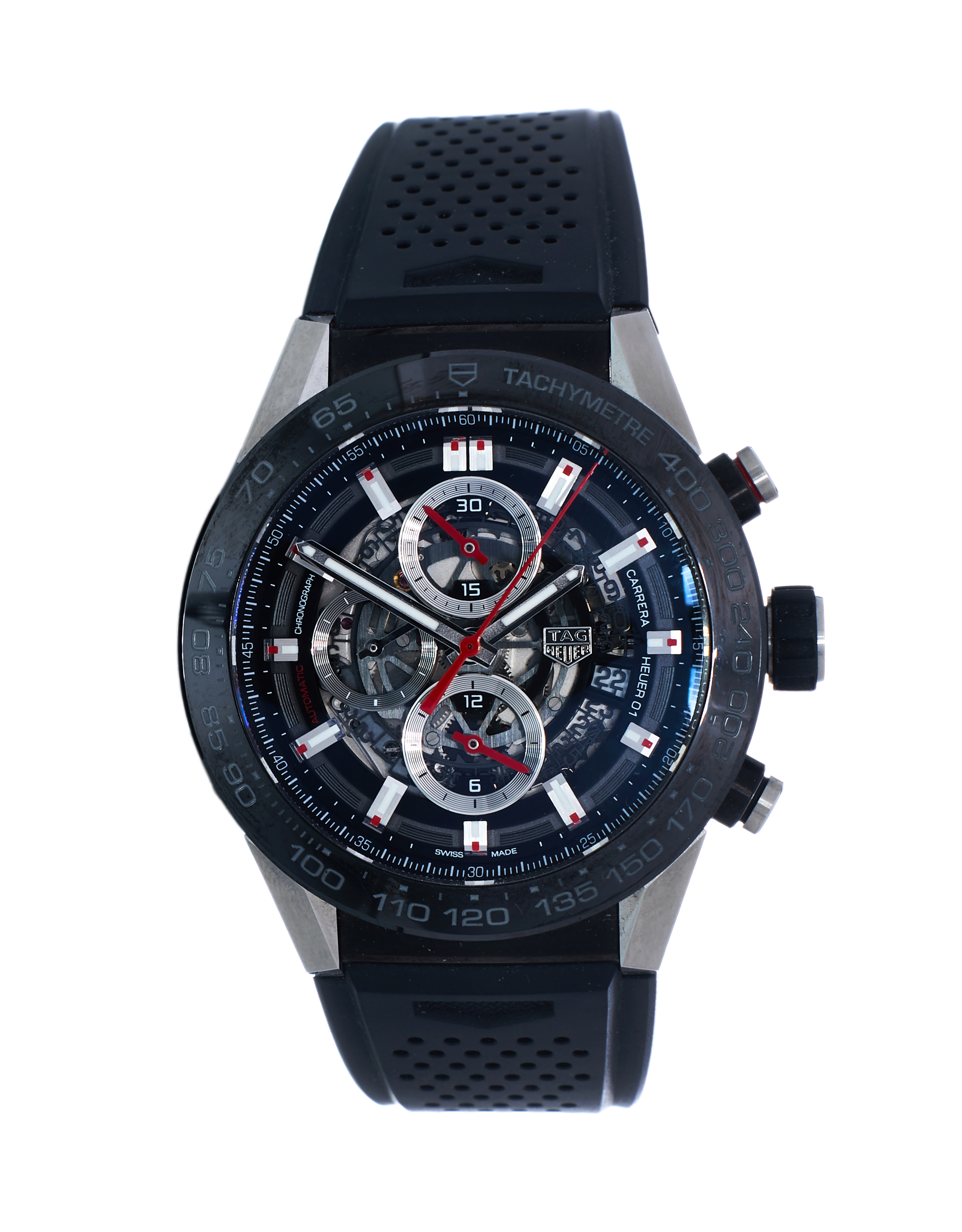 This Tag Heuer Carrera CAR201V.FT6046 has a black baton dial and a rubber strap. This Tag Heuer has undergone a thorough inspection of accuracy, functionality and condition at our Tag Heuer certified service centre to determine the level of reconditioning required to meet our strict standards. It has also been checked against our records to ensure authenticity. All our watches have a 24-month warranty for your peace of mind.