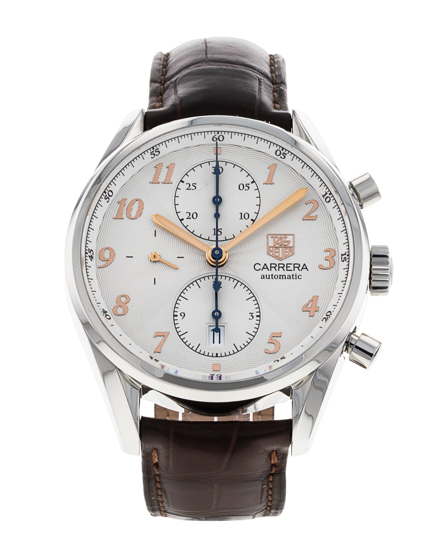This Tag Heuer Carrera CAS2112.FC6291 has a silver arabic dial and a leather strap. This Tag Heuer has undergone a thorough inspection of accuracy, functionality and condition at our Tag Heuer certified service centre to determine the level of reconditioning required to meet our strict standards. It has also been checked against our records to ensure authenticity. All our watches have a 24-month warranty for your peace of mind.