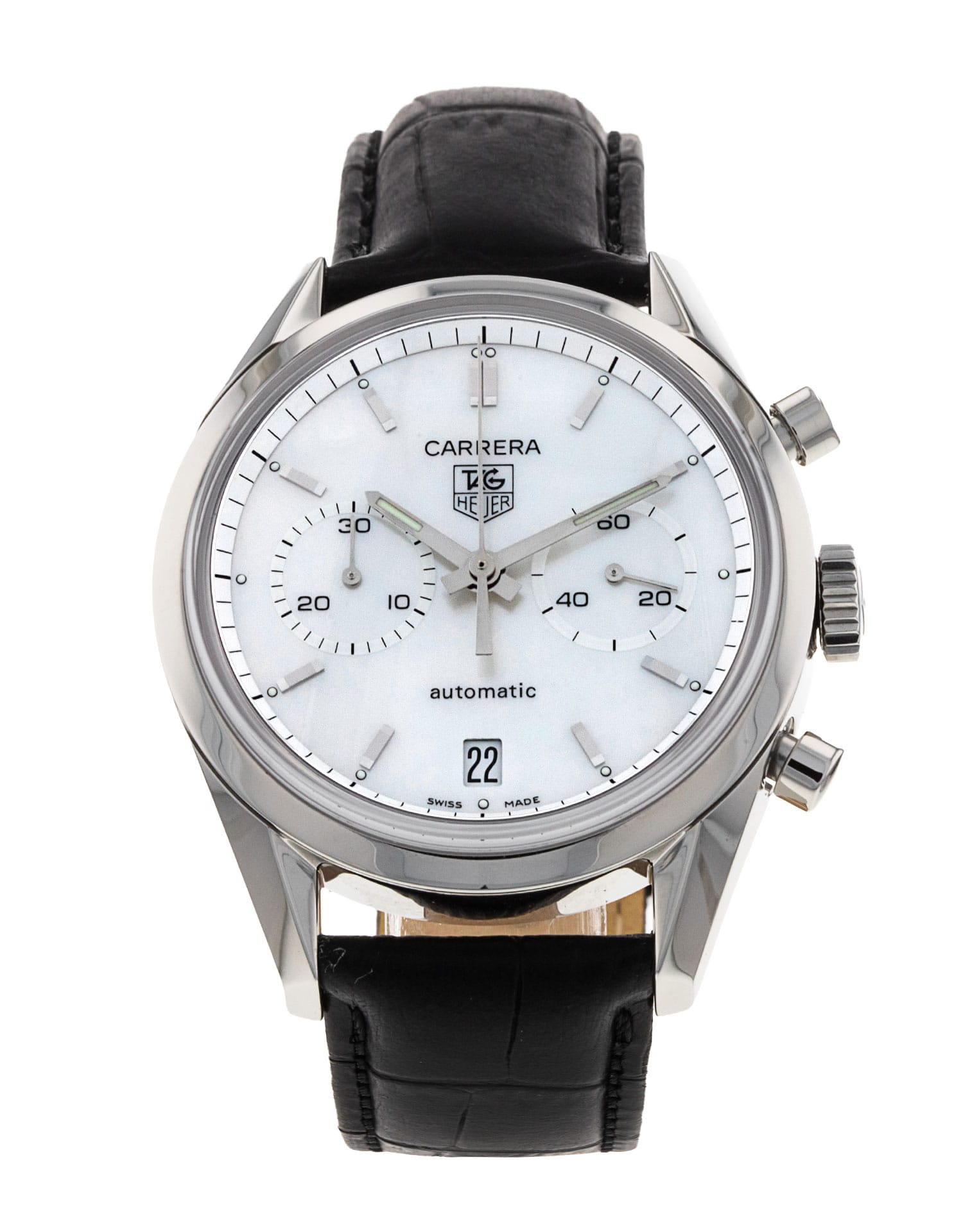 This Tag Heuer Carrera CV2115.FC6185 has a mother of pearl white baton dial and a leather strap. This Tag Heuer has undergone a thorough inspection of accuracy, functionality and condition at our Tag Heuer certified service centre to determine the level of reconditioning required to meet our strict standards. It has also been checked against our records to ensure authenticity. Our watches have a 24-month warranty for your peace of mind, in conjunction with any remaining manufacturer’s warranty from new or from service.