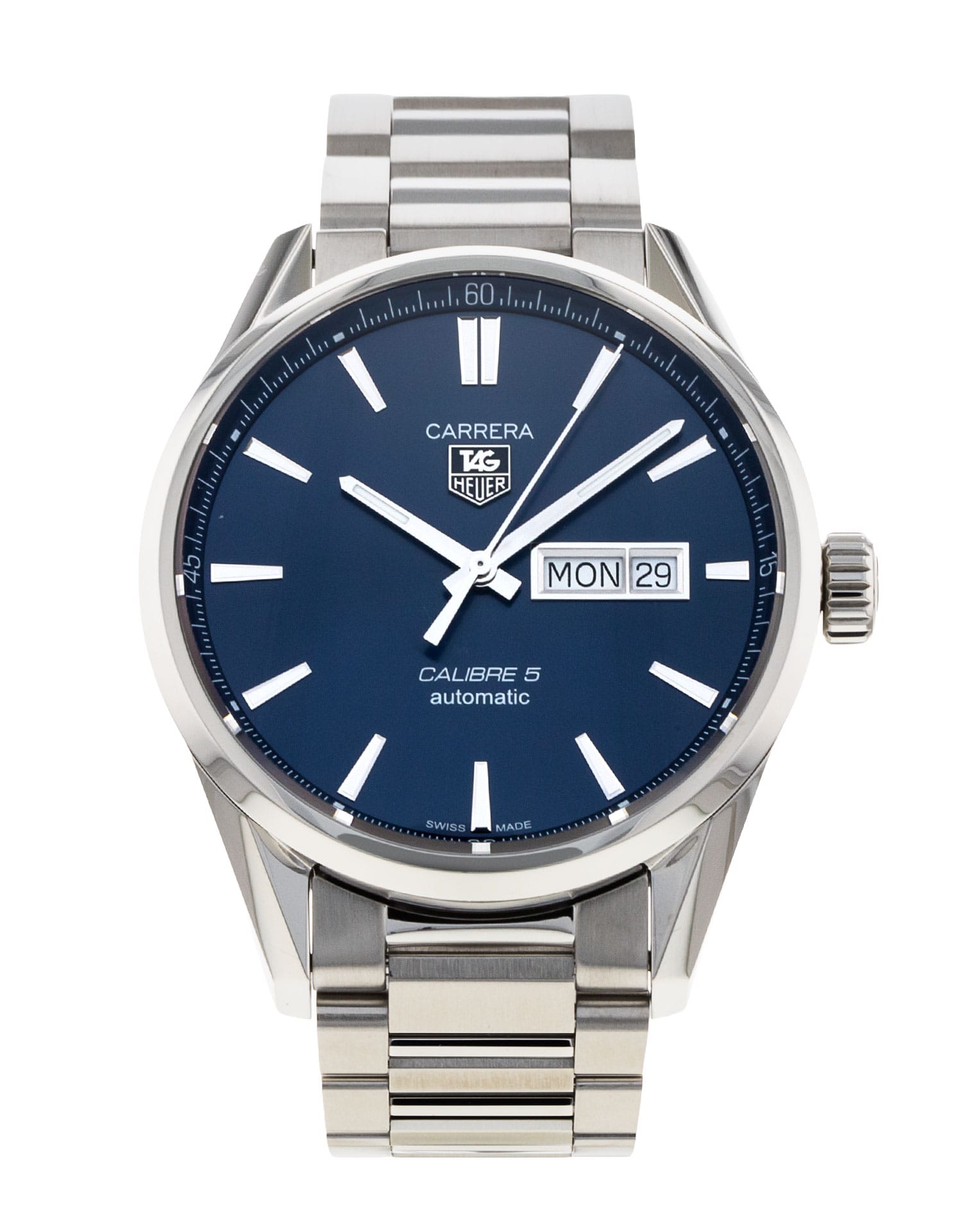 This Tag Heuer Carrera WAR201E.BA0723 has a blue baton dial and a bracelet strap. This Tag Heuer has undergone a thorough inspection of accuracy, functionality and condition at our Tag Heuer certified service centre to determine the level of reconditioning required to meet our strict standards. It has also been checked against our records to ensure authenticity. All our watches have a 24-month warranty for your peace of mind.