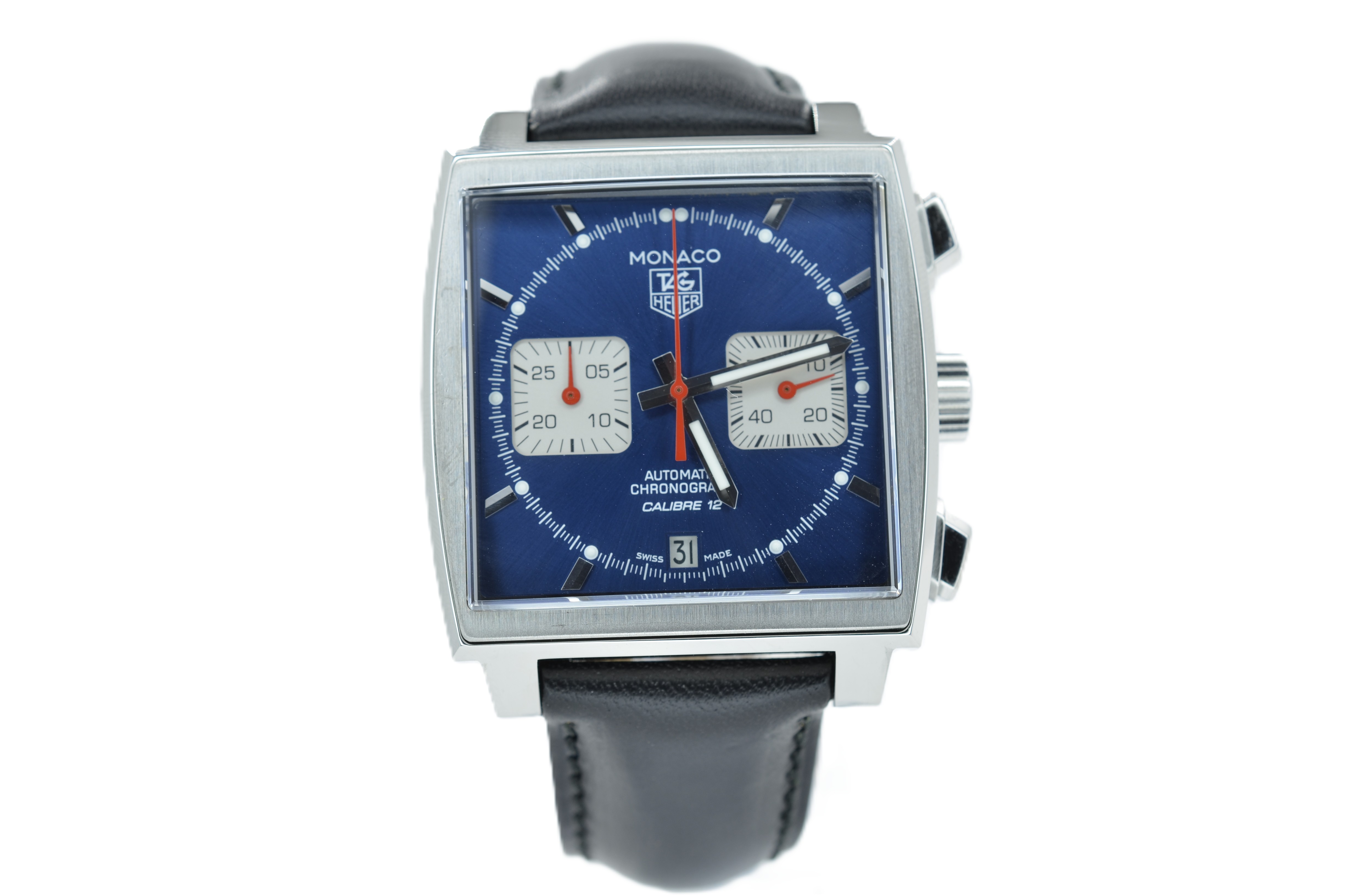 This Tag Heuer Monaco CAW2111.FC6183 has a blue baton dial and a leather strap. This Tag Heuer has undergone a thorough inspection of accuracy, functionality and condition at our Tag Heuer certified service centre to determine the level of reconditioning required to meet our strict standards. It has also been checked against our records to ensure authenticity. All our watches have a 24-month warranty for your peace of mind.