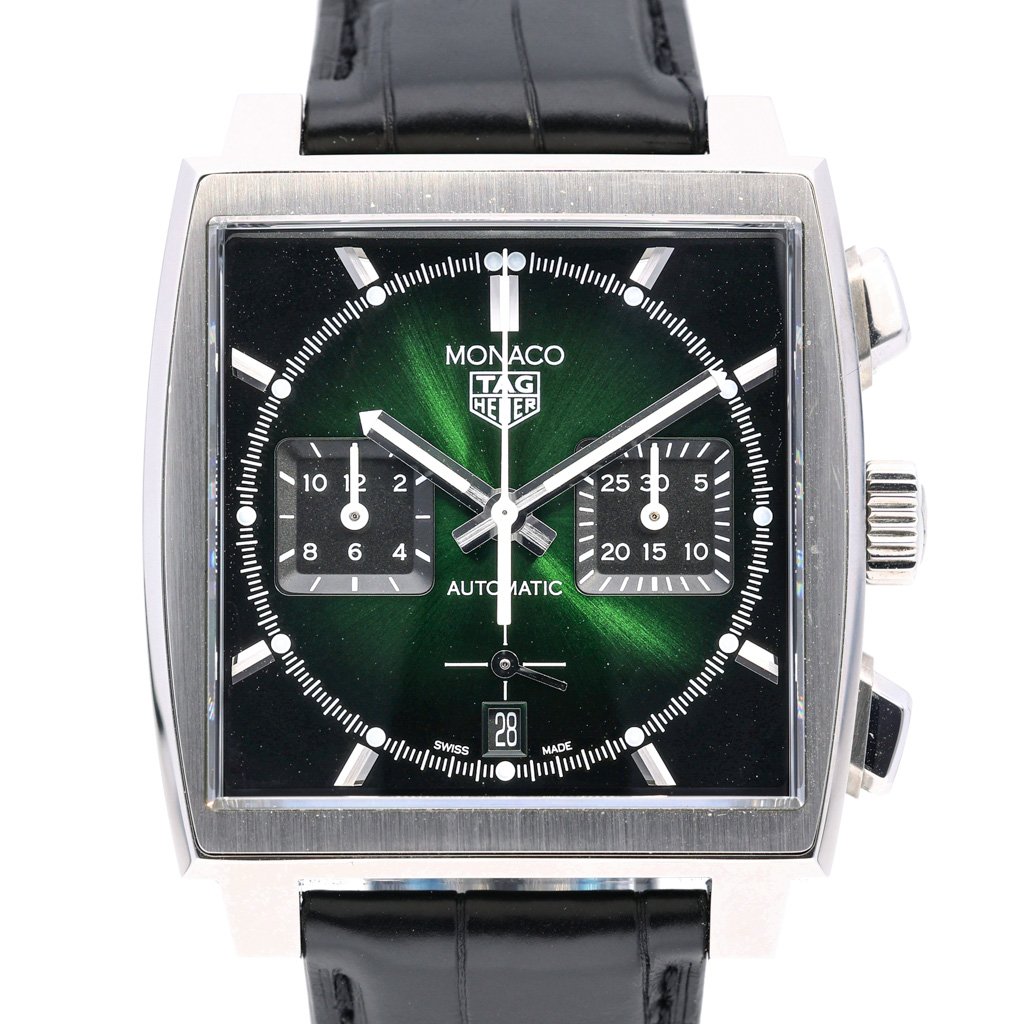 This Tag Heuer Monaco CBL2116.FC6497 has a green baton dial and a leather strap. This Tag Heuer has undergone a thorough inspection of accuracy, functionality and condition at our Tag Heuer certified service centre to determine the level of reconditioning required to meet our strict standards. It has also been checked against our records to ensure authenticity. All our watches have a 24-month warranty for your peace of mind.