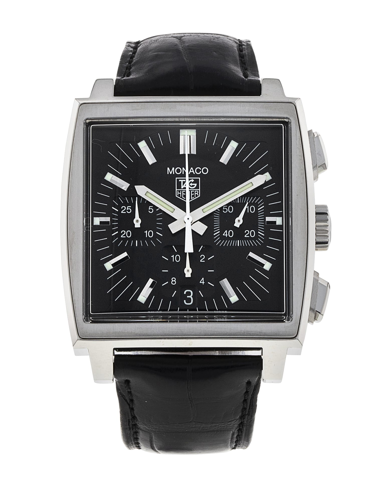 This Tag Heuer Monaco CW2111.FC6177 has a black baton dial and a leather strap. This Tag Heuer has undergone a thorough inspection of accuracy, functionality and condition at our Tag Heuer certified service centre to determine the level of reconditioning required to meet our strict standards. It has also been checked against our records to ensure authenticity. All our watches have a 24-month warranty for your peace of mind.