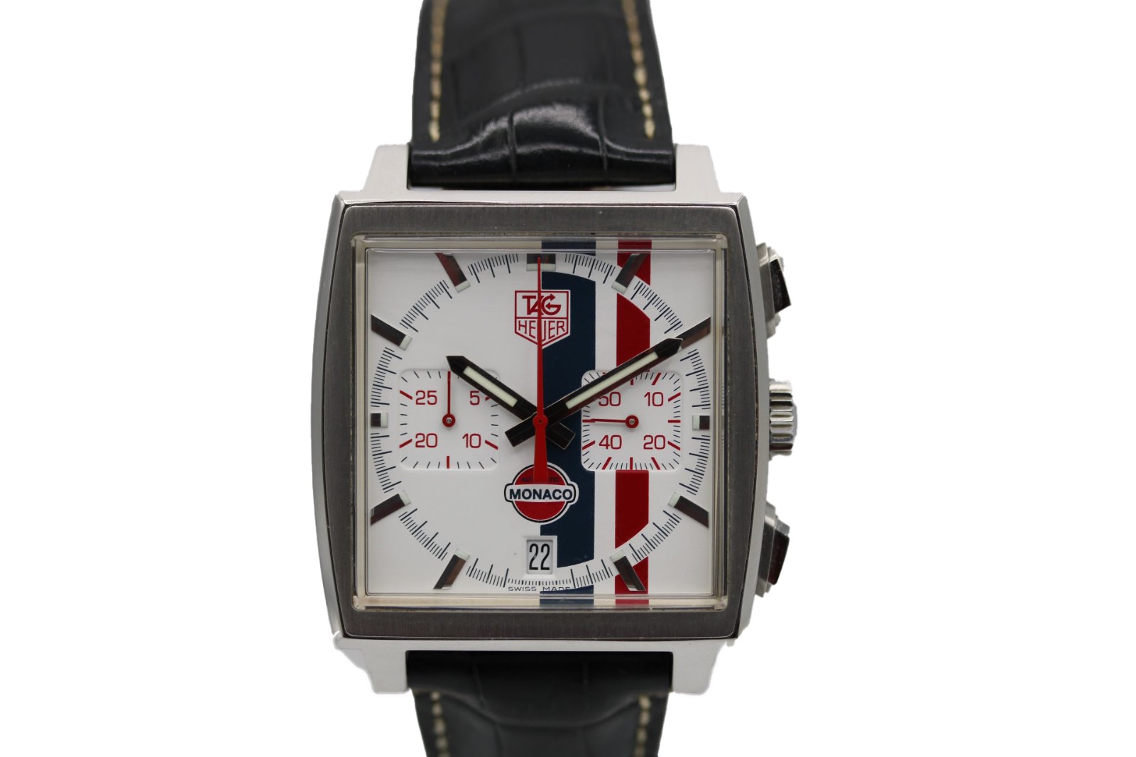 This limited edition Monaco pays tribute to the great Steve McQueen, a famous patron of the original Heuer Monaco. Launched in 2005—what would have been McQueen's 75th birthday—this Monaco has a distinctive white dial (one of the first Monacos ever made in white) with blue and red stripes, identical to those seen on McQueen's race suit in the cult motorsport film Le Mans. It's a fitting tribute, of course, because it was McQueen who made the legendary, square-cased Monaco everything that it is today, after he wore it in the film.