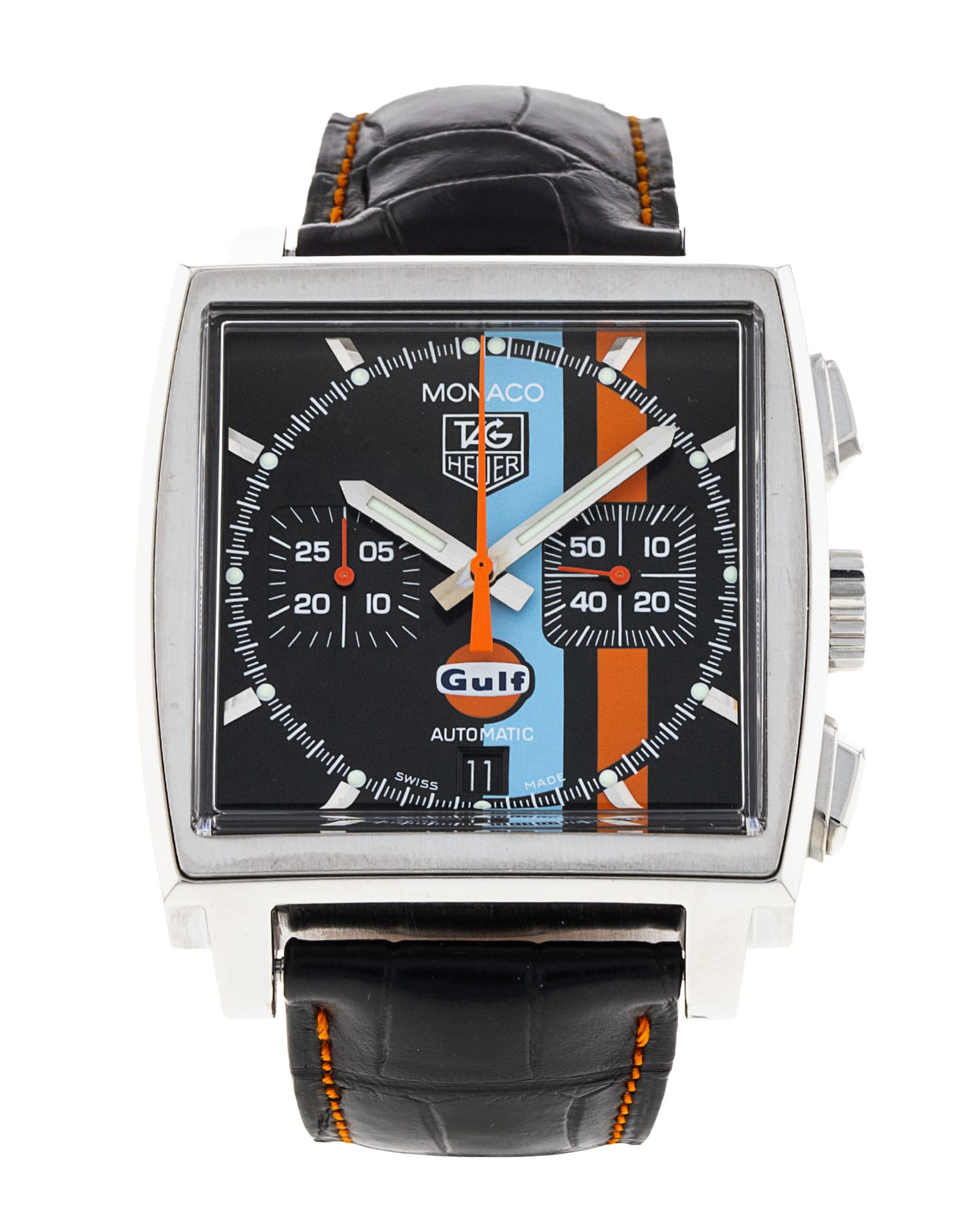 This Tag Heuer Monaco CW211A.FC6228 has a black baton dial and a leather strap. This Tag Heuer has undergone a thorough inspection of accuracy, functionality and condition at our Tag Heuer certified service centre to determine the level of reconditioning required to meet our strict standards. It has also been checked against our records to ensure authenticity. All our watches have a 24-month warranty for your peace of mind.