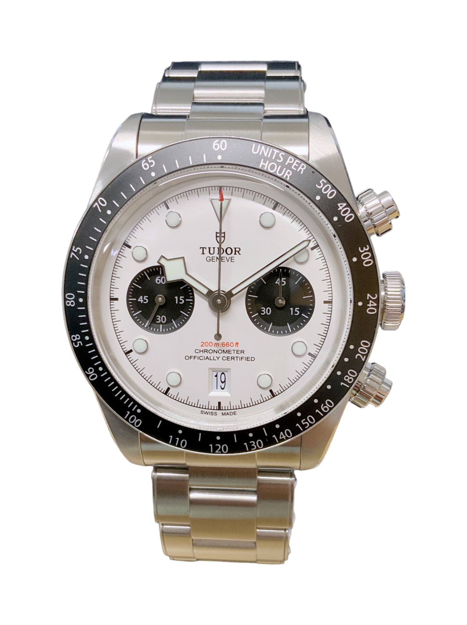 This Tudor Black Bay Chrono M79360N-0002 has a white dial and a bracelet strap. This Tudor has undergone a thorough inspection of water resistance, accuracy, functionality and condition to determine the level of reconditioning required to meet our strict standards. It has also been referenced against technical documents and manufacturer records where available to ensure authenticity and a clean history. Our watches have a 24-month warranty for your peace of mind, in conjunction with any remaining manufacturer’s warranty from new or from service. To maintain the manufacturer’s warranty on this watch, it has not been polished in our service centre.