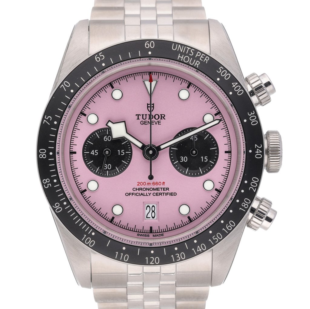 This Tudor Black Bay Chrono M79360N-0019 has a pink dial and a bracelet strap. This Tudor has undergone a thorough inspection of water resistance, accuracy, functionality and condition to determine the level of reconditioning required to meet our strict standards. It has also been referenced against technical documents and manufacturer records where available to ensure authenticity and a clean history. Our watches have a 24-month warranty for your peace of mind, in conjunction with any remaining manufacturer’s warranty from new or from service. To maintain the manufacturer’s warranty on this watch, it has not been polished in our service centre.