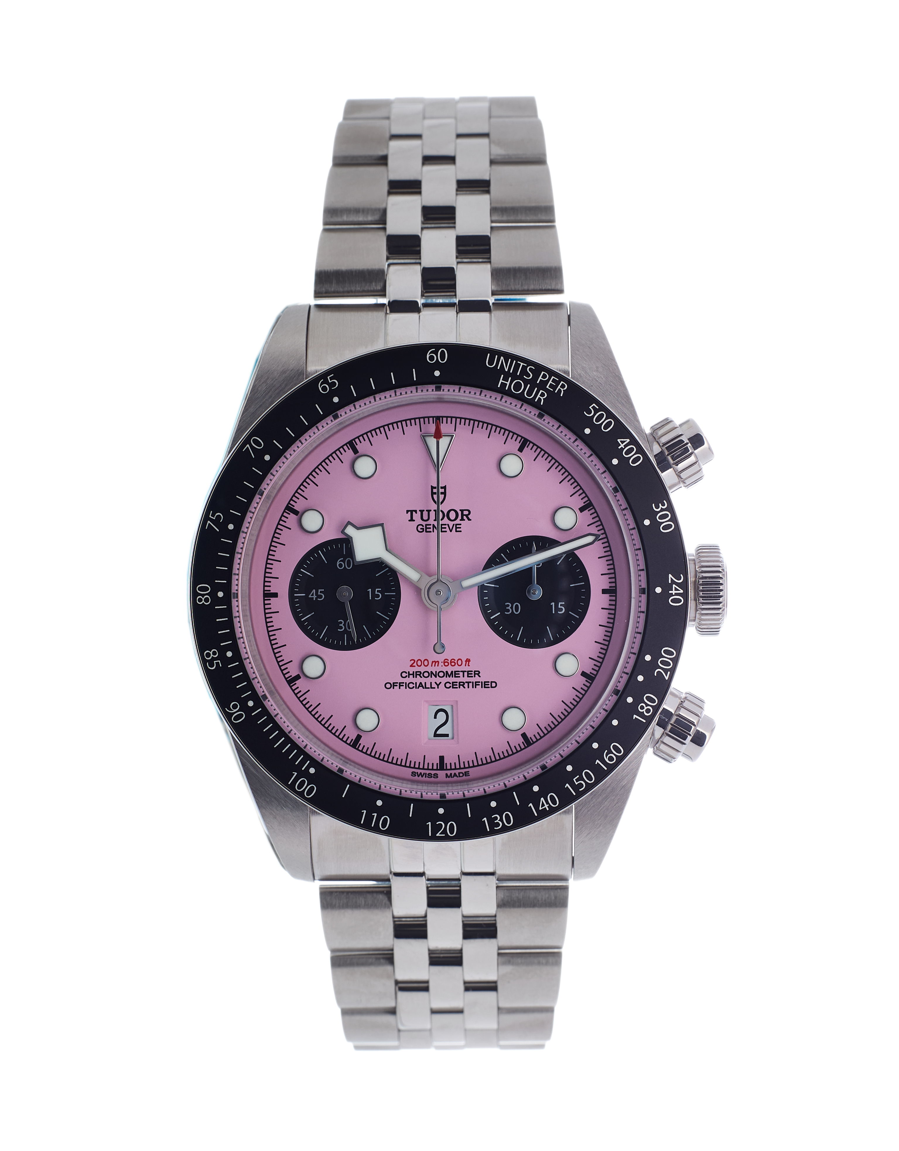 This Tudor Black Bay Chrono M79360N-0019 has a pink dial and a bracelet strap. This Tudor has undergone a thorough inspection of water resistance, accuracy, functionality and condition to determine the level of reconditioning required to meet our strict standards. It has also been referenced against technical documents and manufacturer records where available to ensure authenticity and a clean history. Our watches have a 24-month warranty for your peace of mind, in conjunction with any remaining manufacturer’s warranty from new or from service. To maintain the manufacturer’s warranty on this watch, it has not been polished in our service centre.