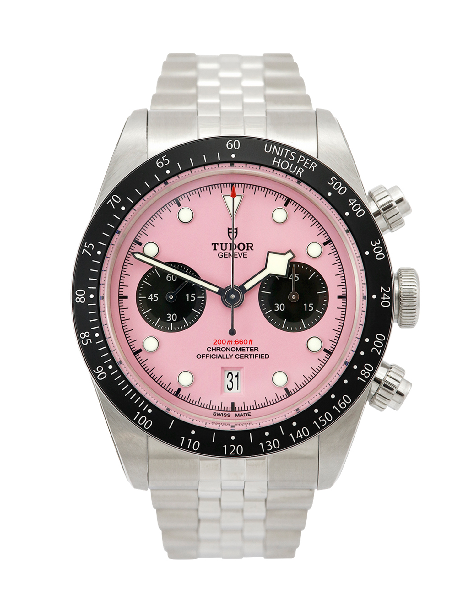 This Tudor Black Bay Chrono M79360N-0019 has a pink dial and a bracelet strap. This Tudor has undergone a thorough inspection of water resistance, accuracy, functionality and condition to determine the level of reconditioning required to meet our strict standards. It has also been referenced against technical documents and manufacturer records where available to ensure authenticity and a clean history. Our watches have a 24-month warranty for your peace of mind, in conjunction with any remaining manufacturer’s warranty from new or from service. To maintain the manufacturer’s warranty on this watch, it has not been polished in our service centre.