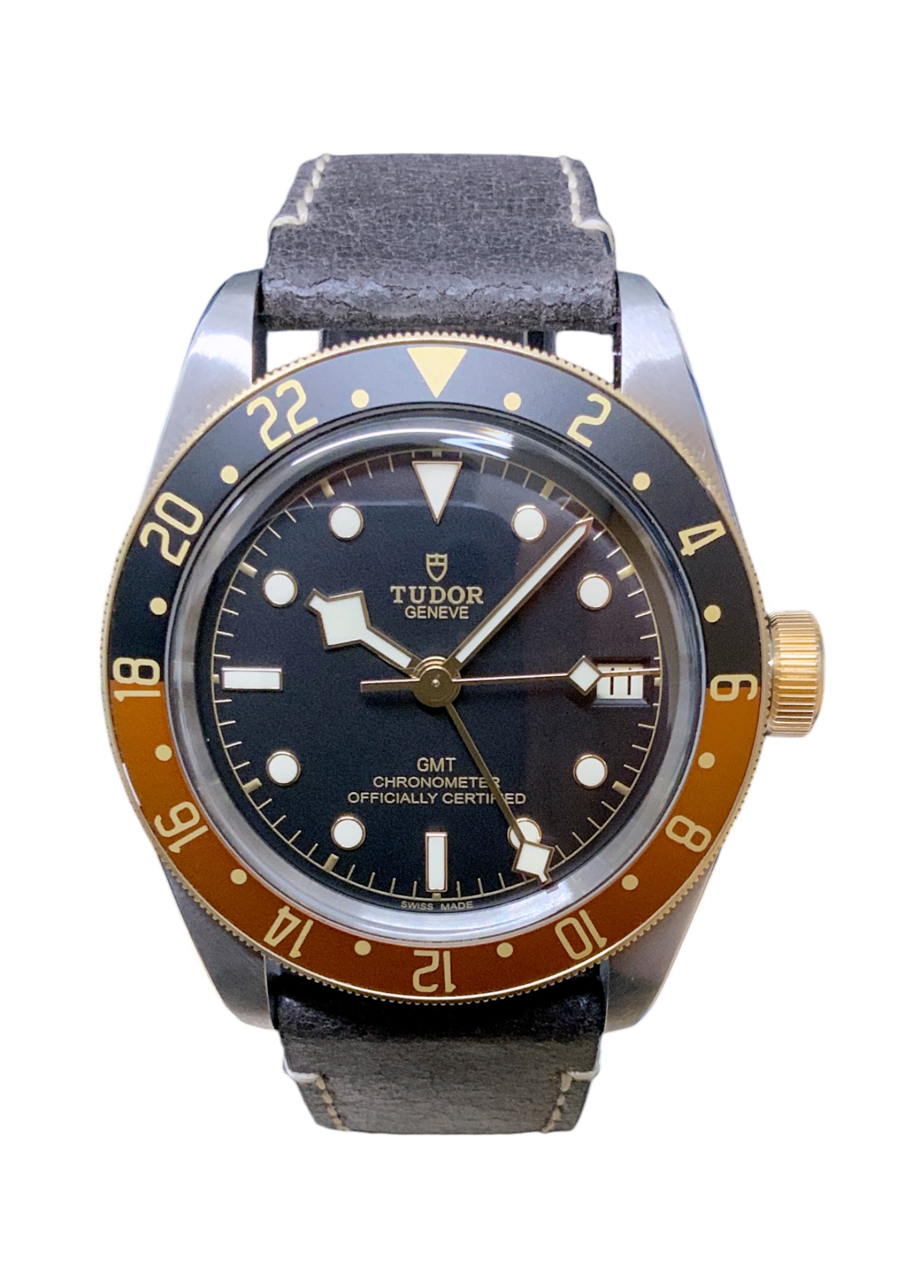 This Tudor Black Bay GMT M79833MN-0003 has a black dial and a leather strap. This Tudor has undergone a thorough inspection of water resistance, accuracy, functionality and condition to determine the level of reconditioning required to meet our strict standards. It has also been referenced against technical documents and manufacturer records where available to ensure authenticity and a clean history. Our watches have a 24-month warranty for your peace of mind, in conjunction with any remaining manufacturer’s warranty from new or from service. To maintain the manufacturer’s warranty on this watch, it has not been polished in our service centre.
