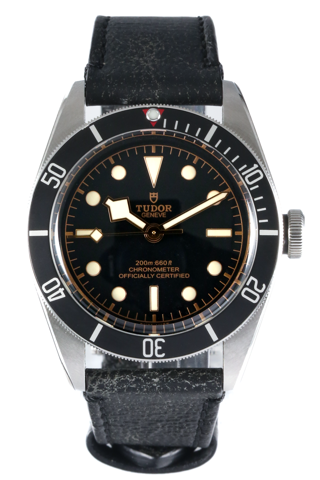 This Tudor Black Bay M79230N-0008 has a black dial and a leather strap. This Tudor has undergone a thorough inspection of water resistance, accuracy, functionality and condition to determine the level of reconditioning required to meet our strict standards. It has also been referenced against technical documents and manufacturer records where available to ensure authenticity and a clean history. All our watches have a 24-month warranty for your peace of mind. One of our skilled polishing technicians has removed marks on the case and bracelet of this watch, brought about by daily wear and tear, which is why this watch does not come with the remaining manufacturer’s warranty.