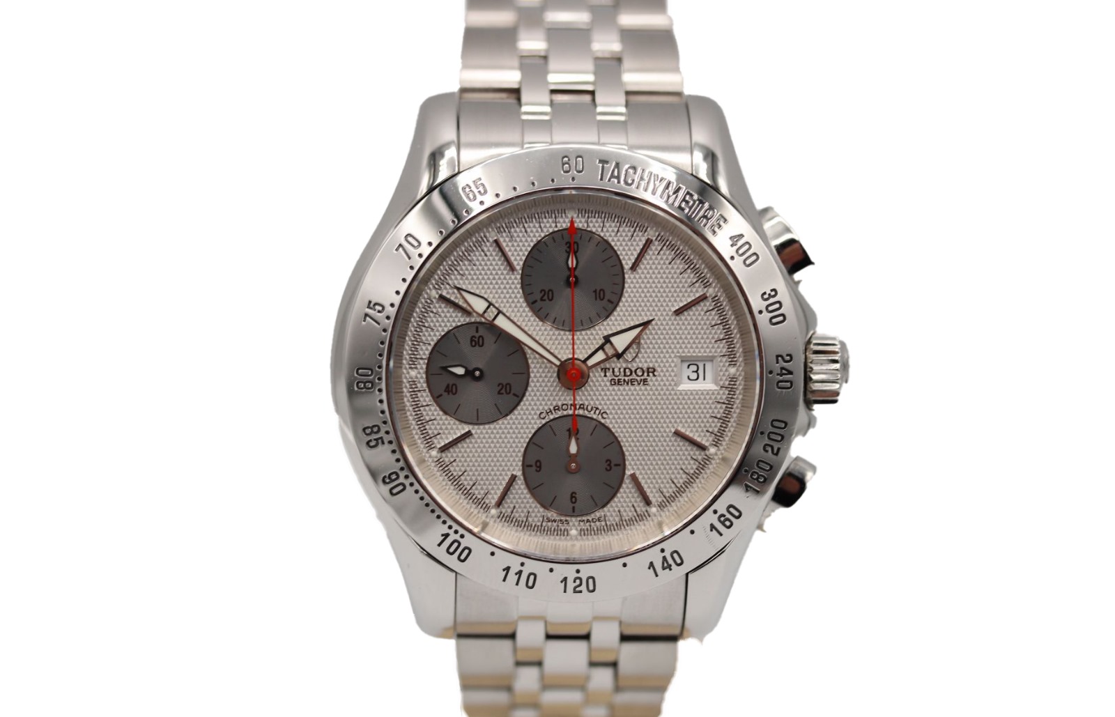 This Tudor Chronautic 79390P has a black dial and a bracelet strap. This Tudor has undergone a thorough inspection of water resistance, accuracy, functionality and condition to determine the level of reconditioning required to meet our strict standards. It has also been referenced against technical documents and manufacturer records where available to ensure authenticity and a clean history. All our watches have a 24-month warranty for your peace of mind. One of our skilled polishing technicians has removed marks on the case and bracelet of this watch, brought about by daily wear and tear, which is why this watch does not come with the remaining manufacturer’s warranty.