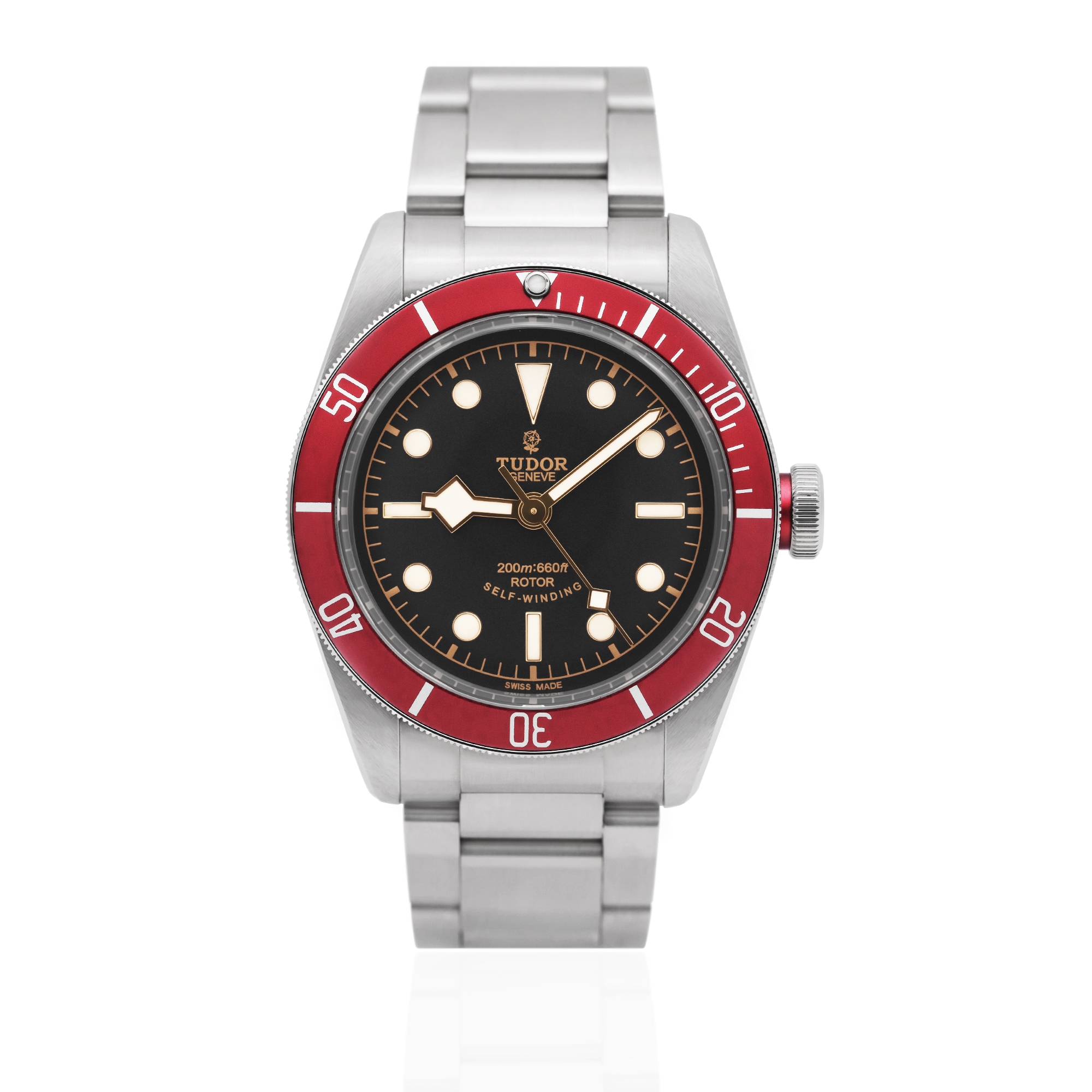 This Tudor Heritage Black Bay 79220R has a black dial and a bracelet strap. This Tudor has undergone a thorough inspection of water resistance, accuracy, functionality and condition to determine the level of reconditioning required to meet our strict standards. It has also been referenced against technical documents and manufacturer records where available to ensure authenticity and a clean history. All our watches have a 24-month warranty for your peace of mind. One of our skilled polishing technicians has removed marks on the case and bracelet of this watch, brought about by daily wear and tear, which is why this watch does not come with the remaining manufacturer’s warranty.
